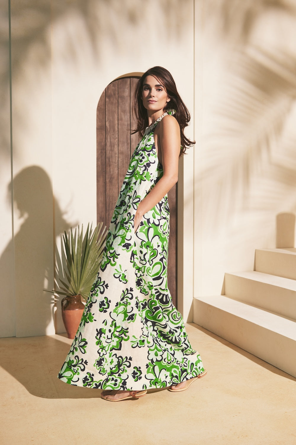 • Maxi halter column dress with functional ties at back neck