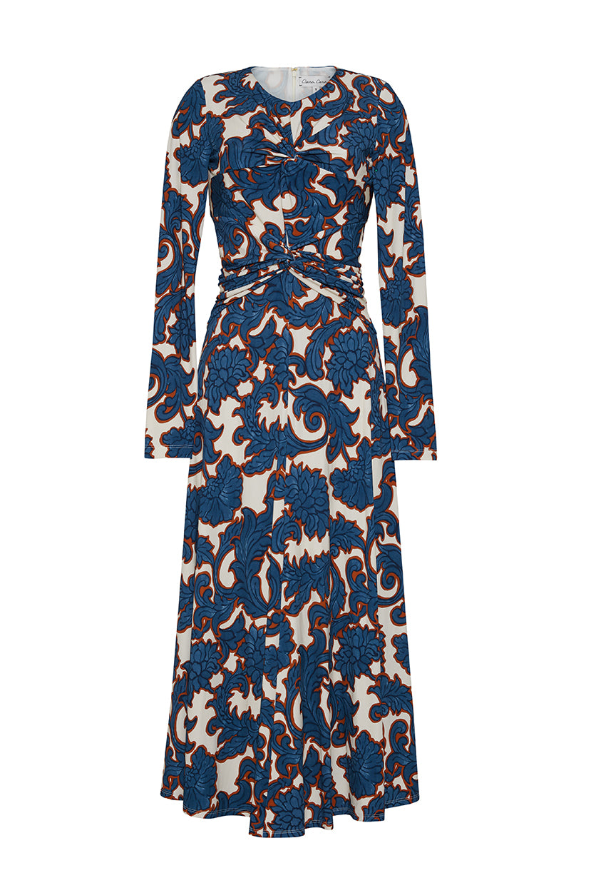 • Midi dress with two knots at front bodice and waist for fitted silhouette with flowy hem