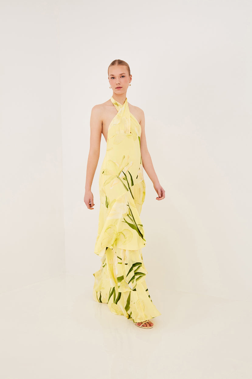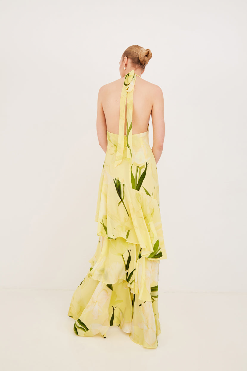 • Halter maxi dress with asymmetrical circular ruffle tiers