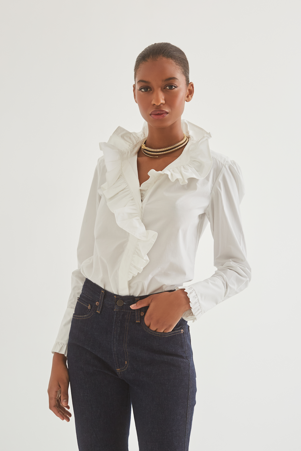 The shirting capsule was created to add effortless glamour to casual looks. The Anne is our more elegant top, featuring a ruffle trim collared neckline, long sleeves and button cuffs and front.