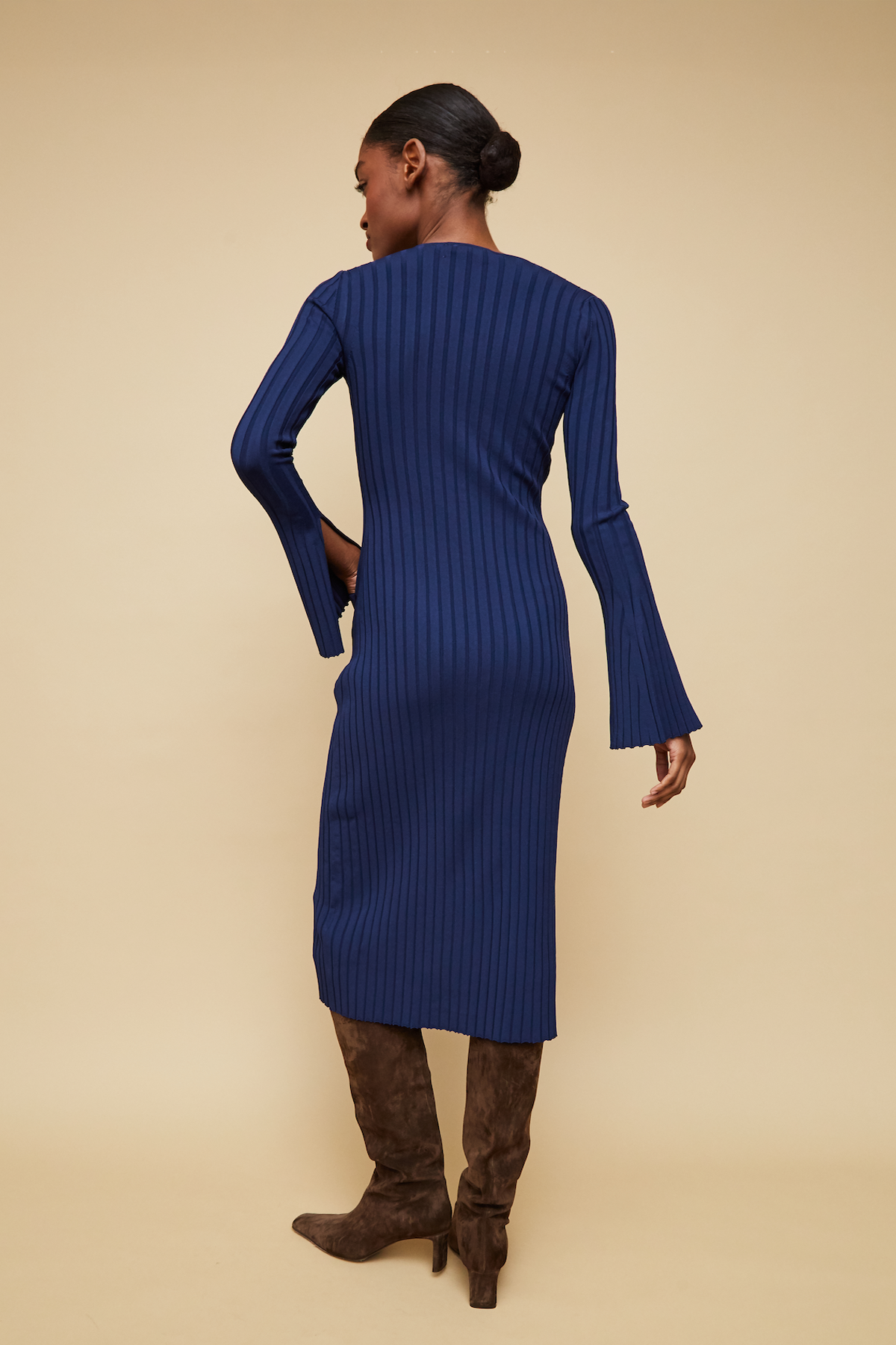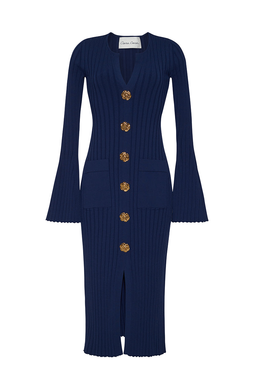 • Midi, long flared sleeve sheath dress with non-functional gold flower shank buttons