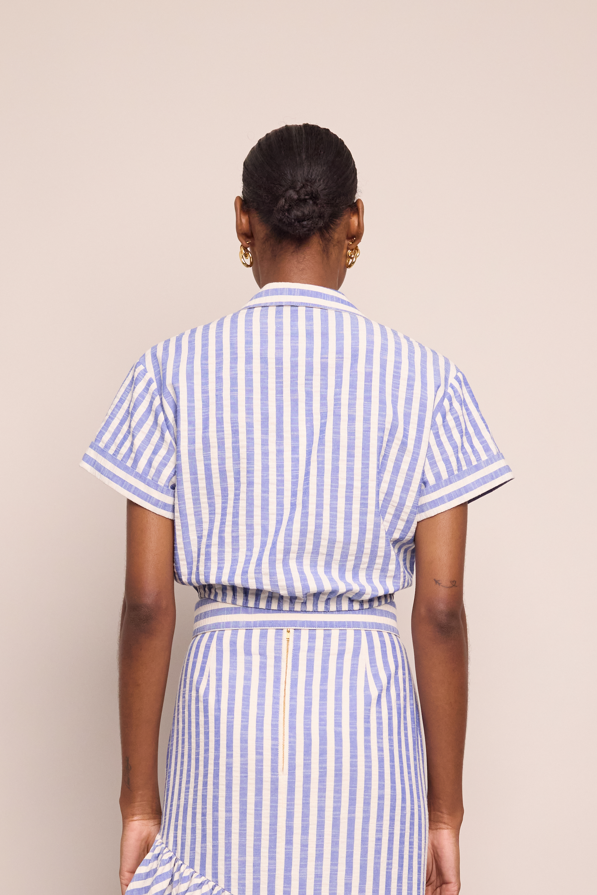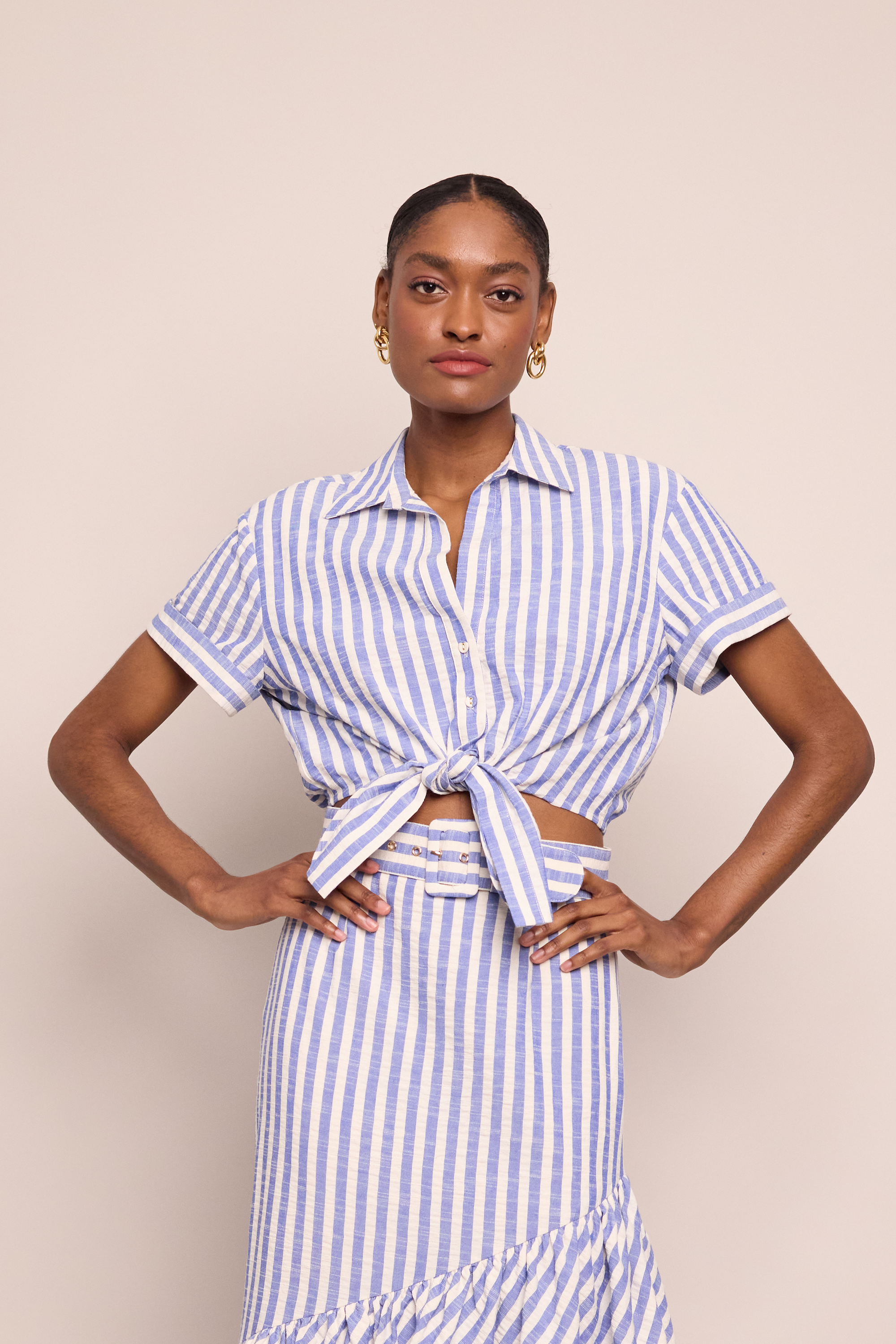 A reimagined classic short sleeve button up, the new Asbury Top adds an extra dose of ease and glamour to an everyday basic. The cropped shirt features a button opening, cuffed sleeve and a front tie bow detail.