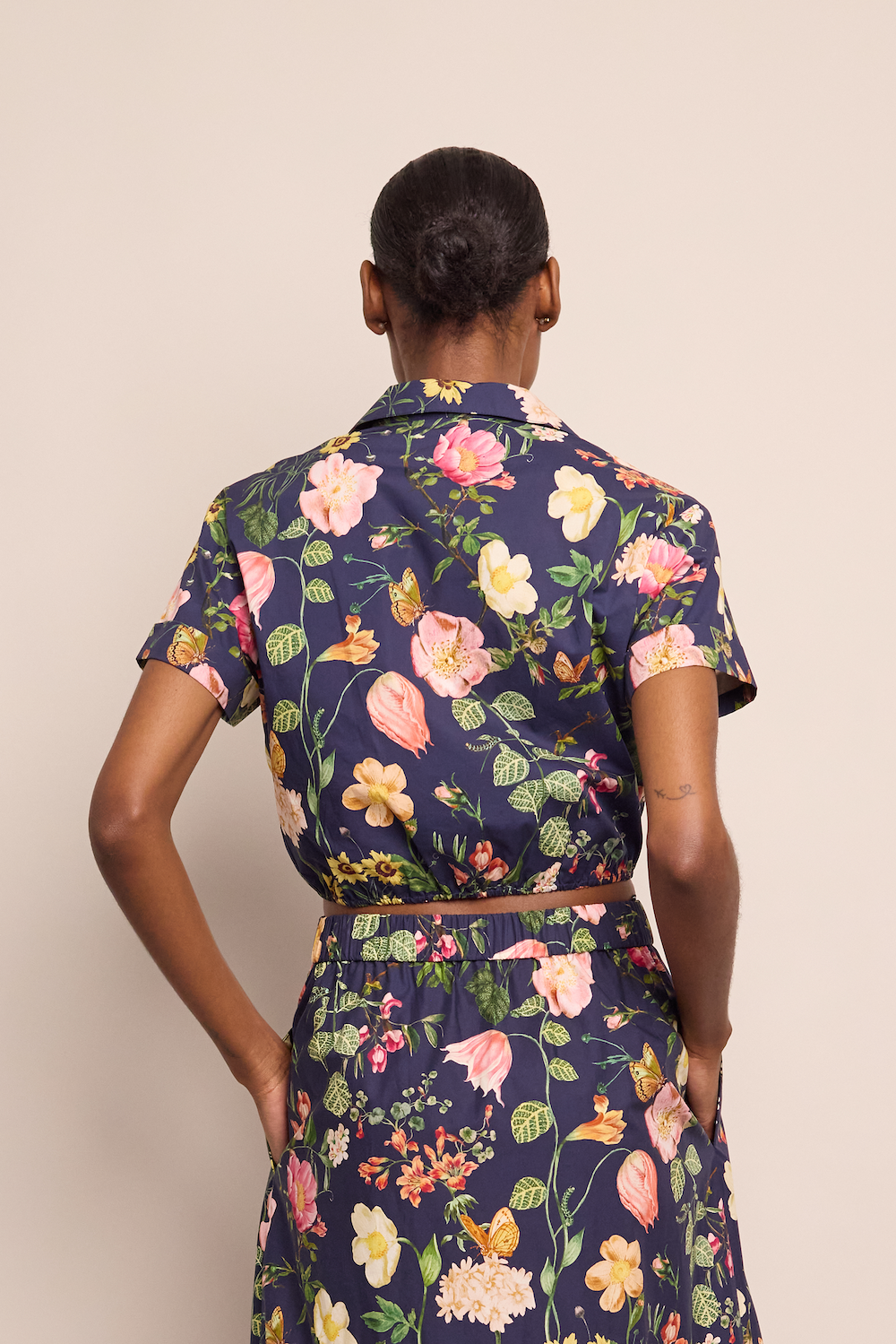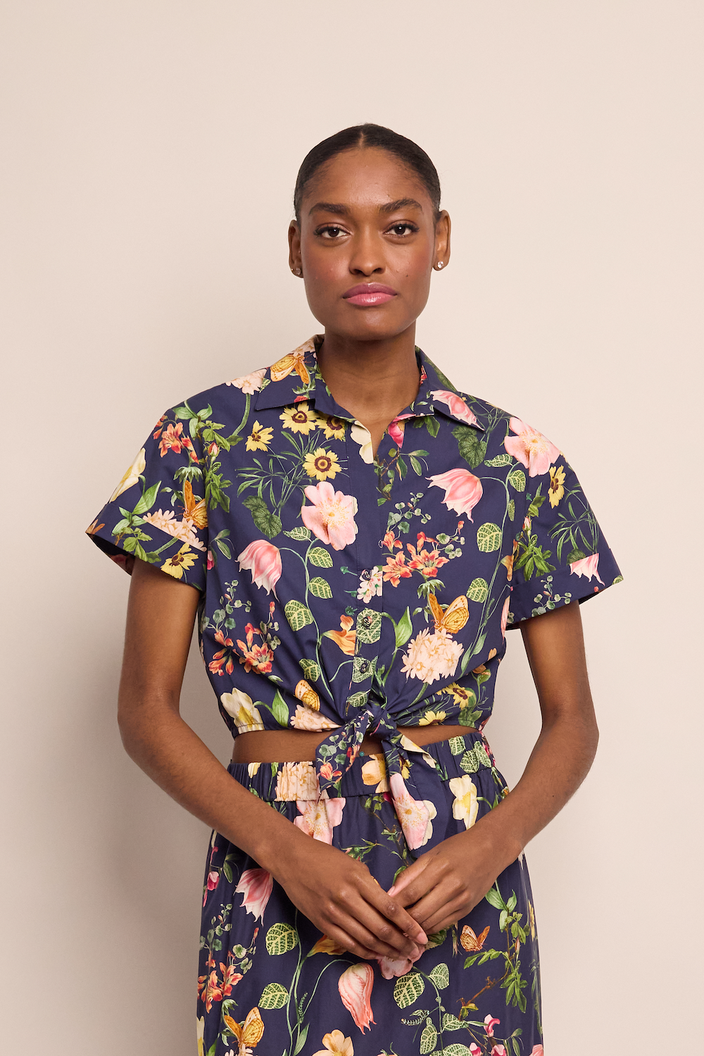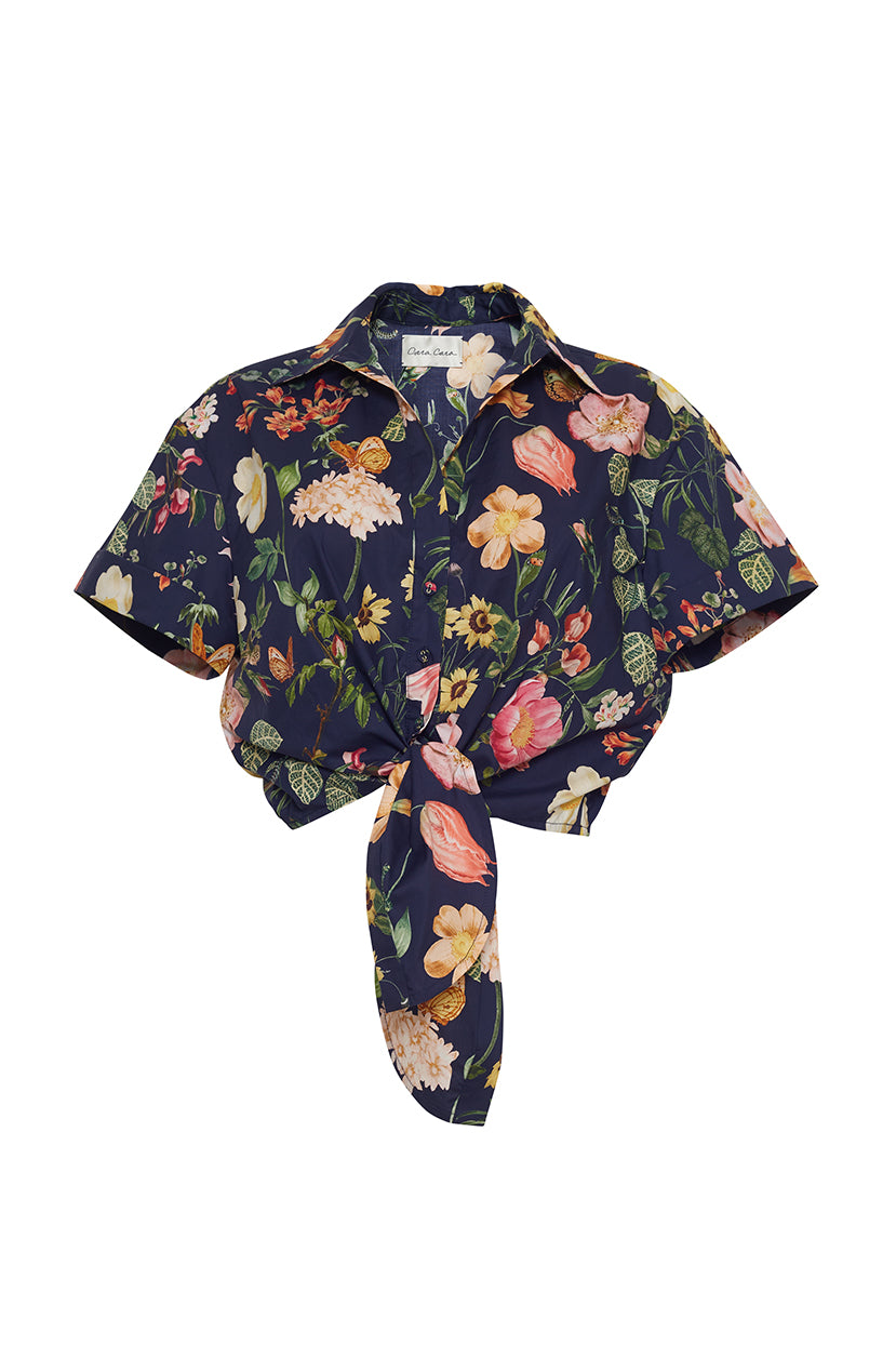 Cropped button down shirt with front button opening. Tie front bow detail. Short sleeve with cuff. Elastic at back hem for adjustability. Unlined. Allover print.