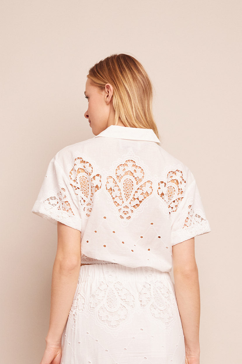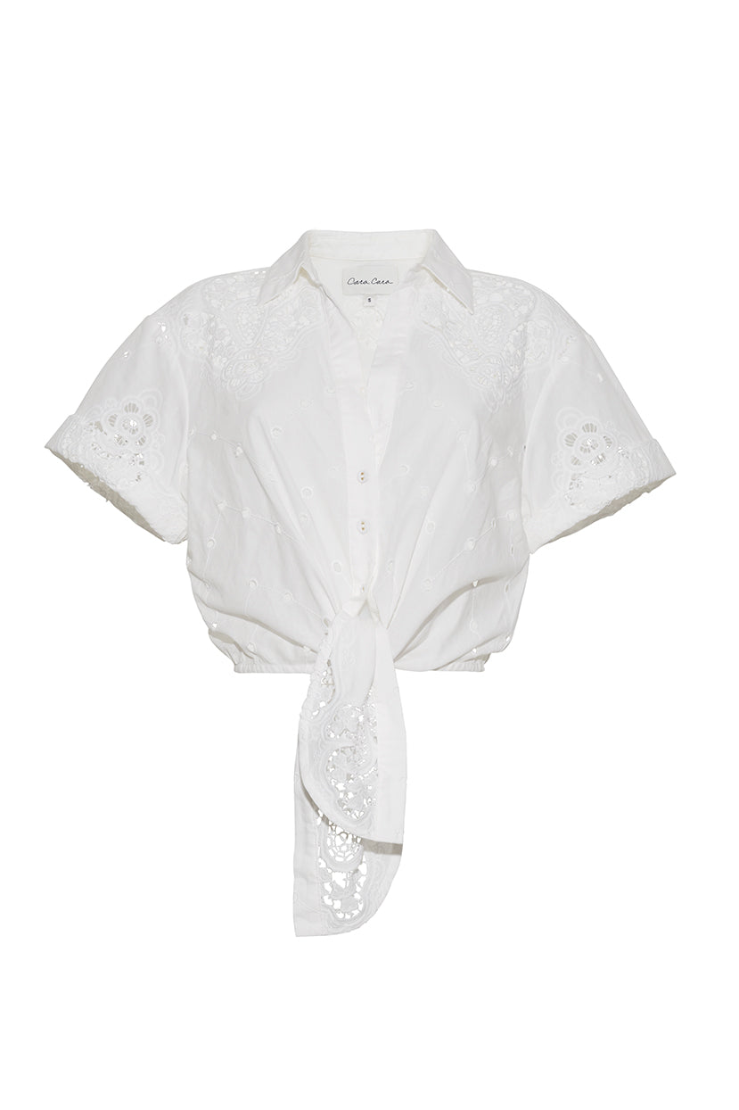 A reimagined classic short sleeve button up, the new Asbury Top adds an extra dose of ease and glamour to an everyday basic. The cropped shirt features a button opening, cuffed sleeve and a front tie bow detail. Pair with matching eyelet Chase Skirt or an easy bottom for your summer picnics or lunch in town.