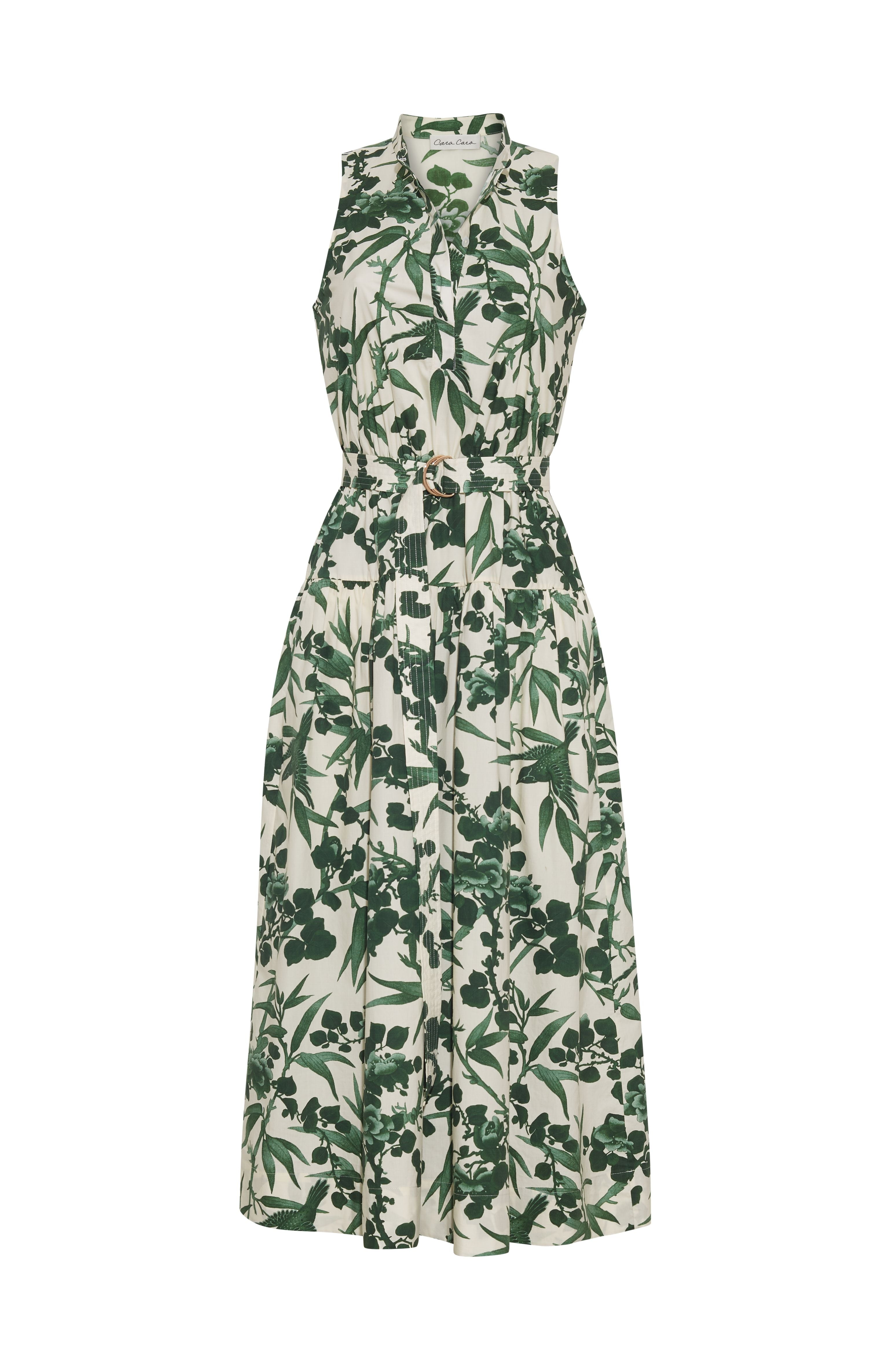 • Sleeveless waisted midi shirtdress with mock-neck collar and concealed half placket with mother of pearl buttons