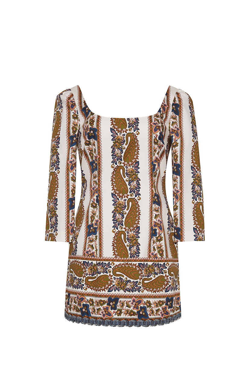 Slim fit. Square neckline. Three-quarter inside puff sleeves. Lined. Bra loop at internal shoulder seam. Waist darts and bust dart for shaping. Allover print.