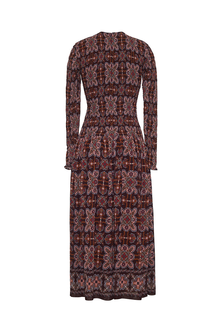 • Fully smocked bodice and long sleeve crewneck midi dress with drop-waist and gathering below waist seam