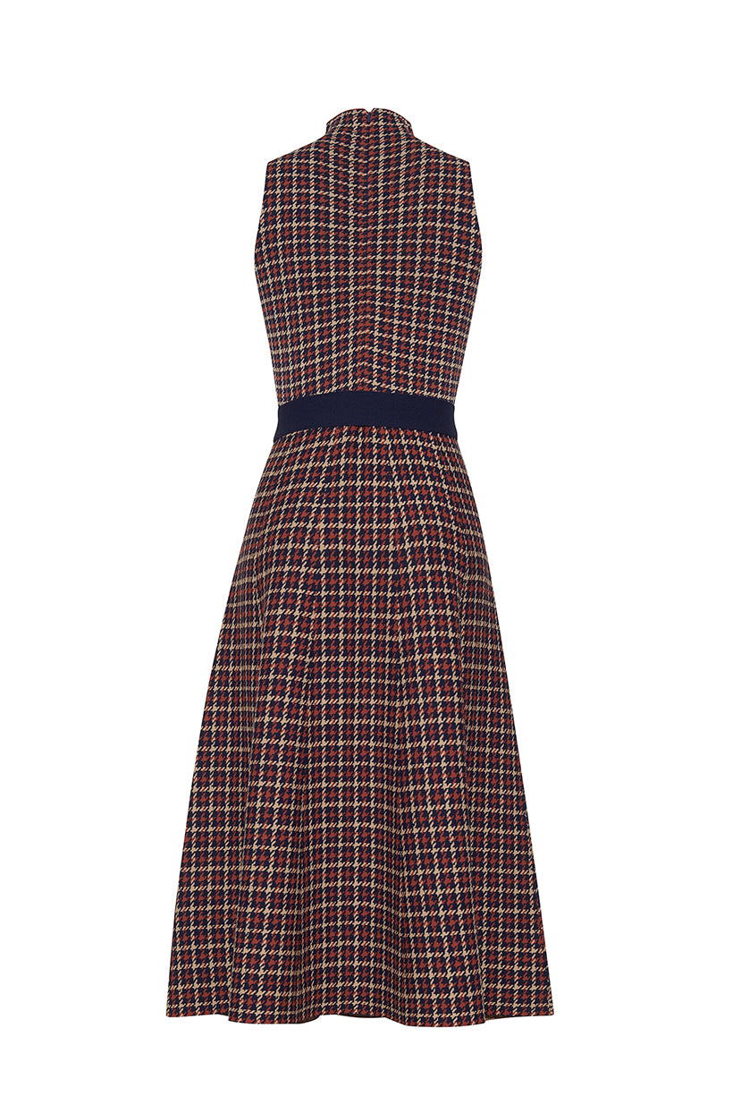 • Funnel-neck sleeveless flared midi dress with fashioned plaid knit jacquard
