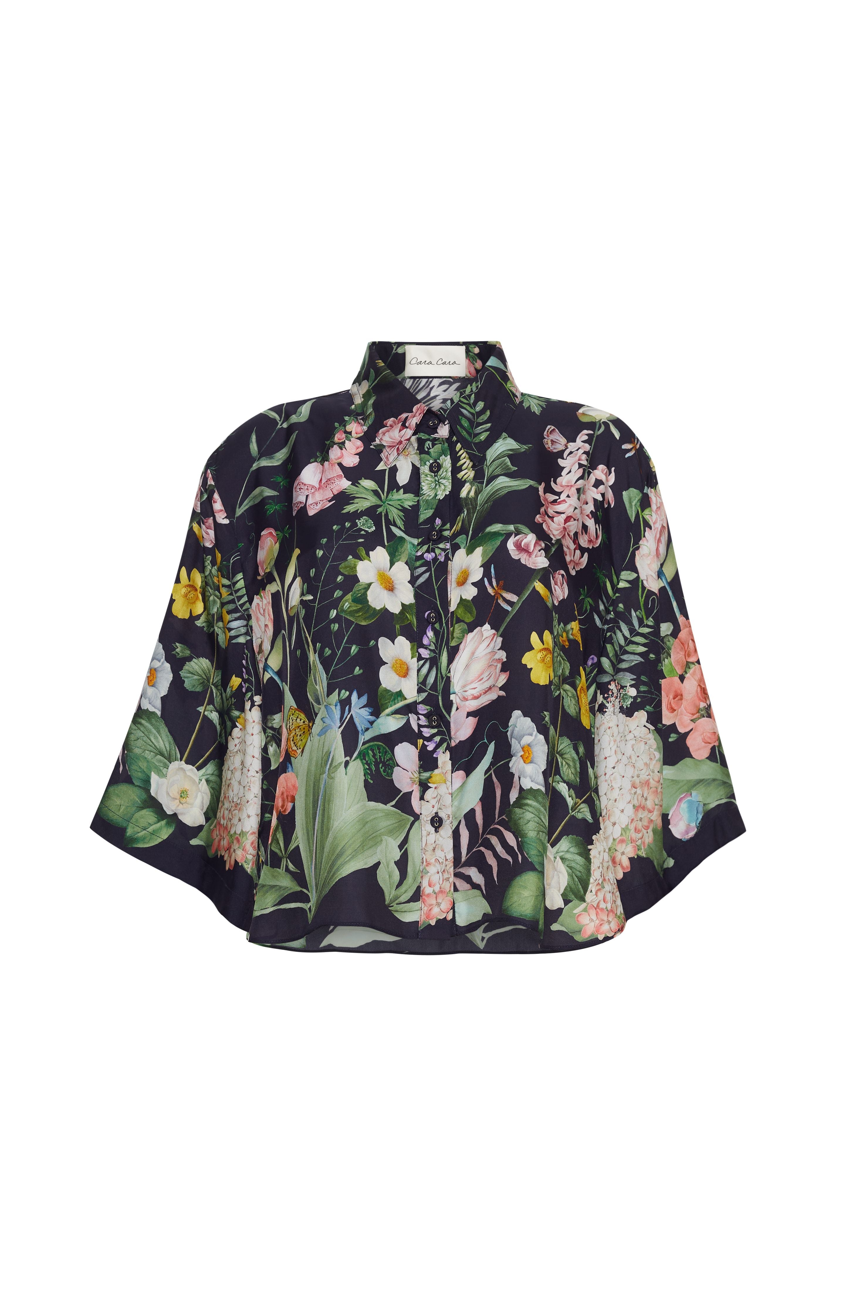 • Easy, flowy silk twill, collared, button down camp shirt with 3/4 sleeves