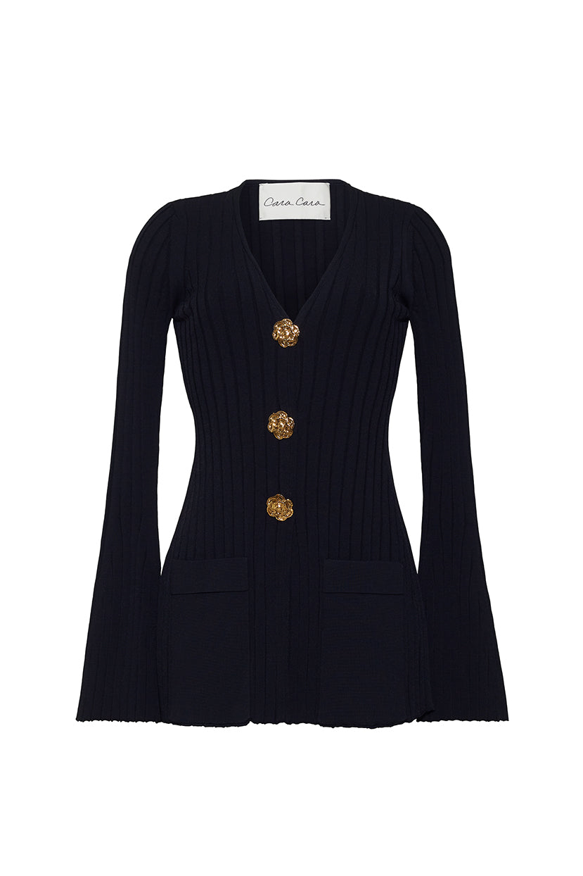 • Tunic length, V-neck, long flare sleeve rib top with non-functional gold flower shank buttons