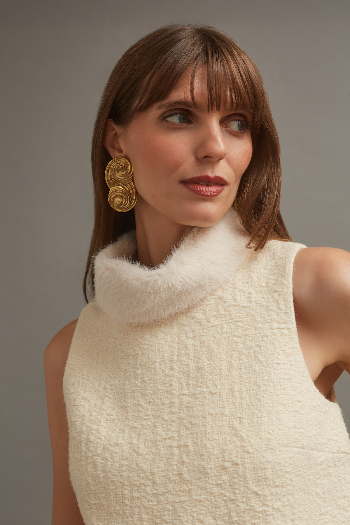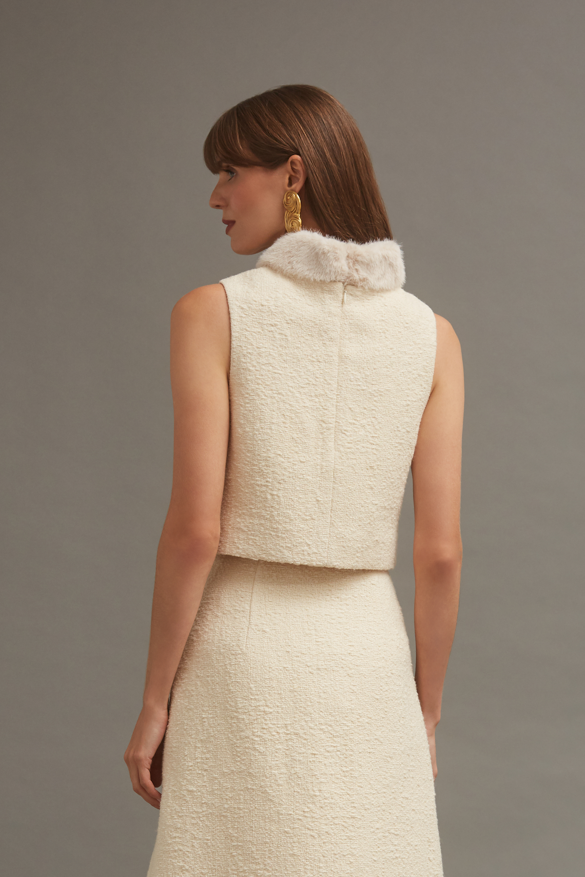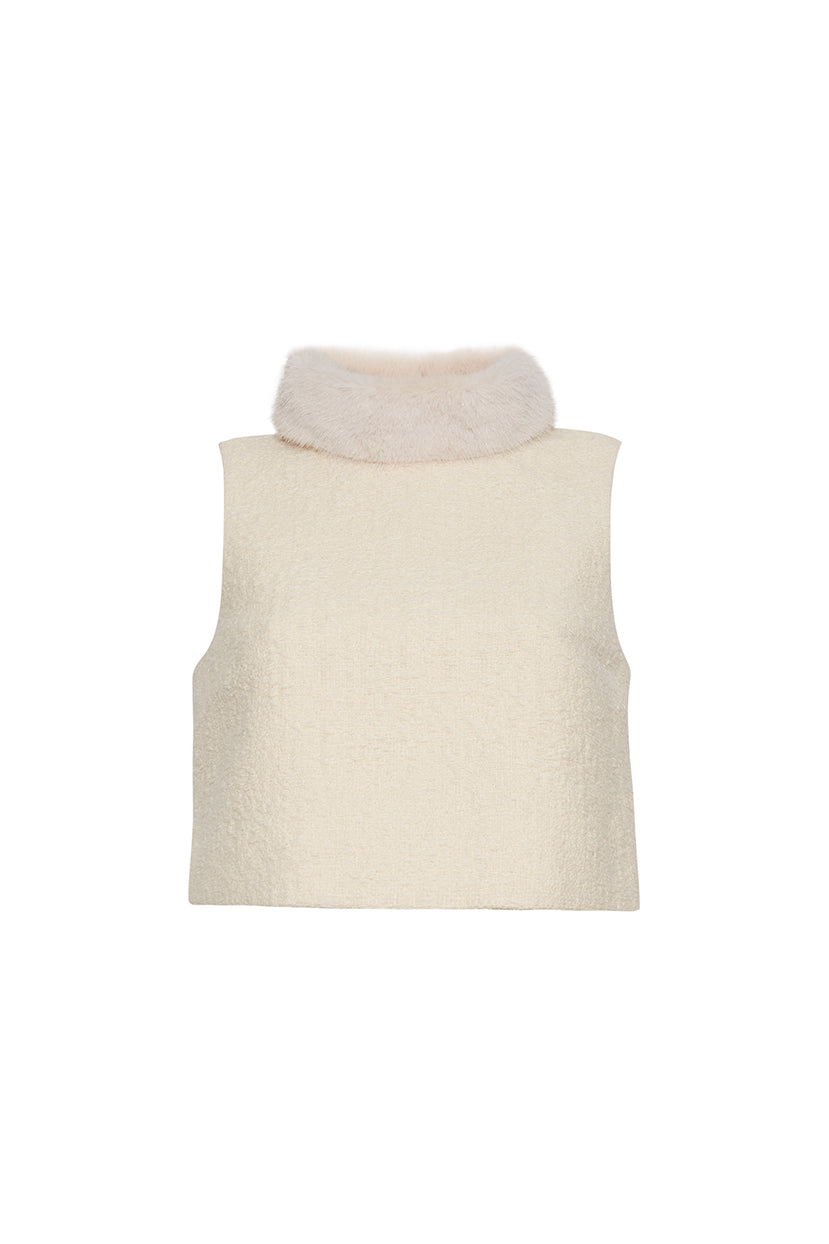 • Sleeveless Italian boucle shell top with detachable faux fur collar
