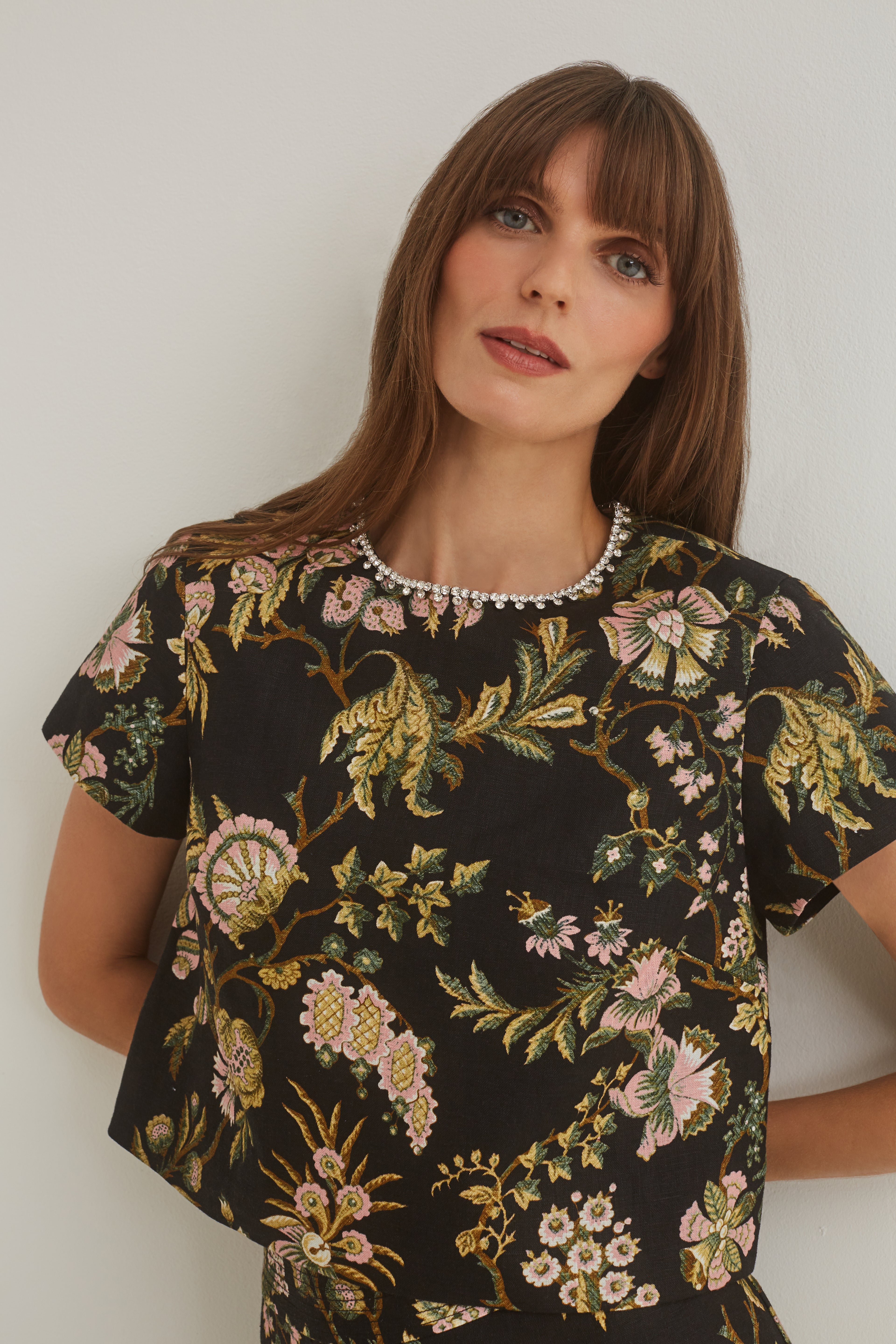 • Shortsleeve cropped top with embellished novelty rhinestone with silver metal trim around neckline