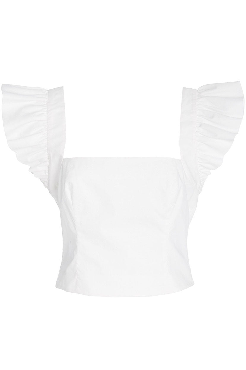 The Hyannis top is designed from crisp cotton-poplin with a square neckline and ruffled trim at the straps adding a flirty touch to this versatile piece.