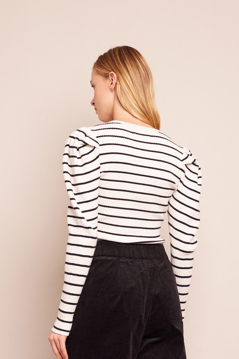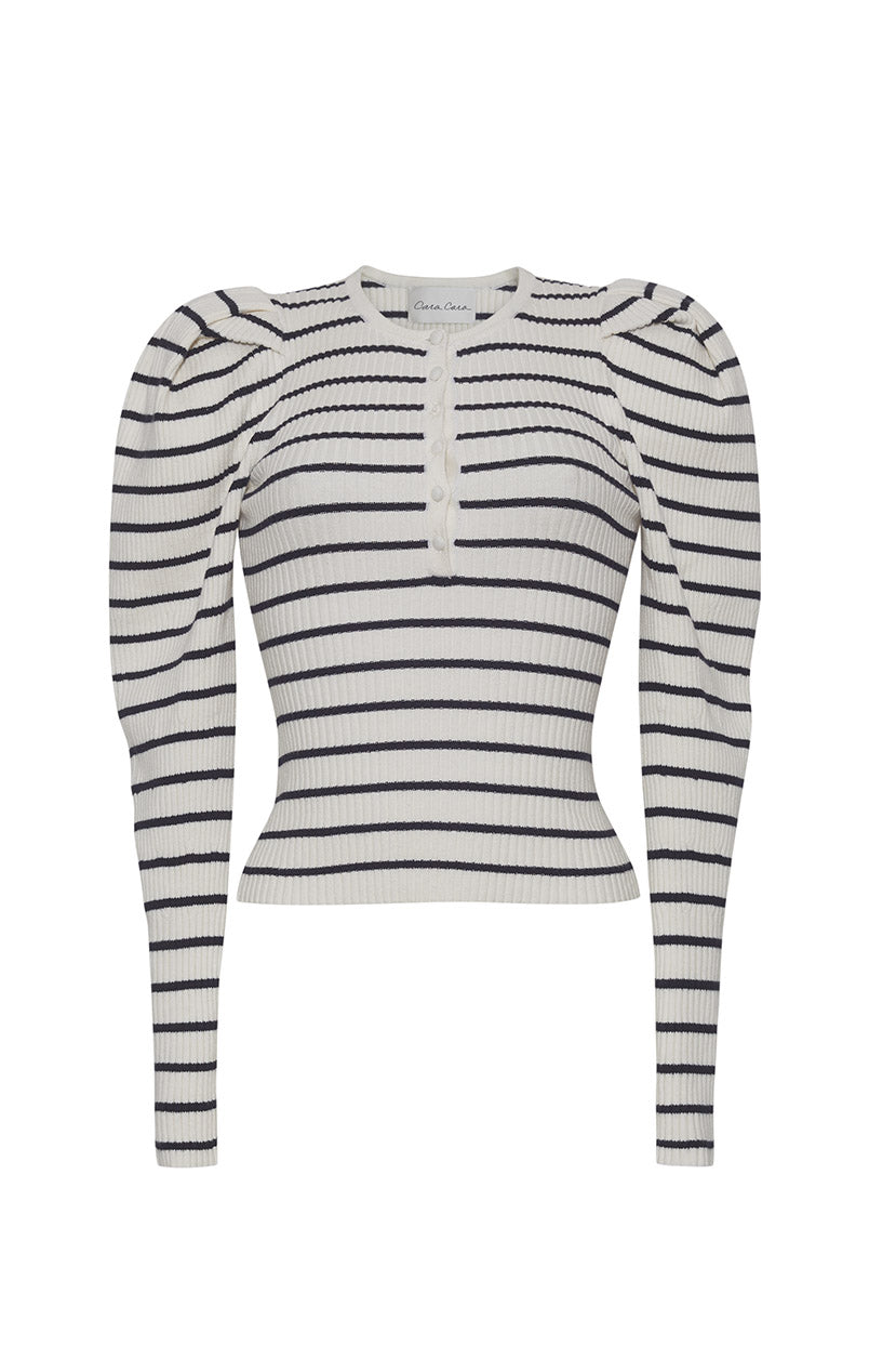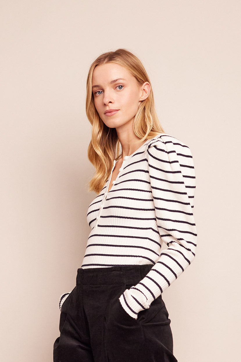 • Button down, henley neck, puff-shoulder long sleeve pullover sweater