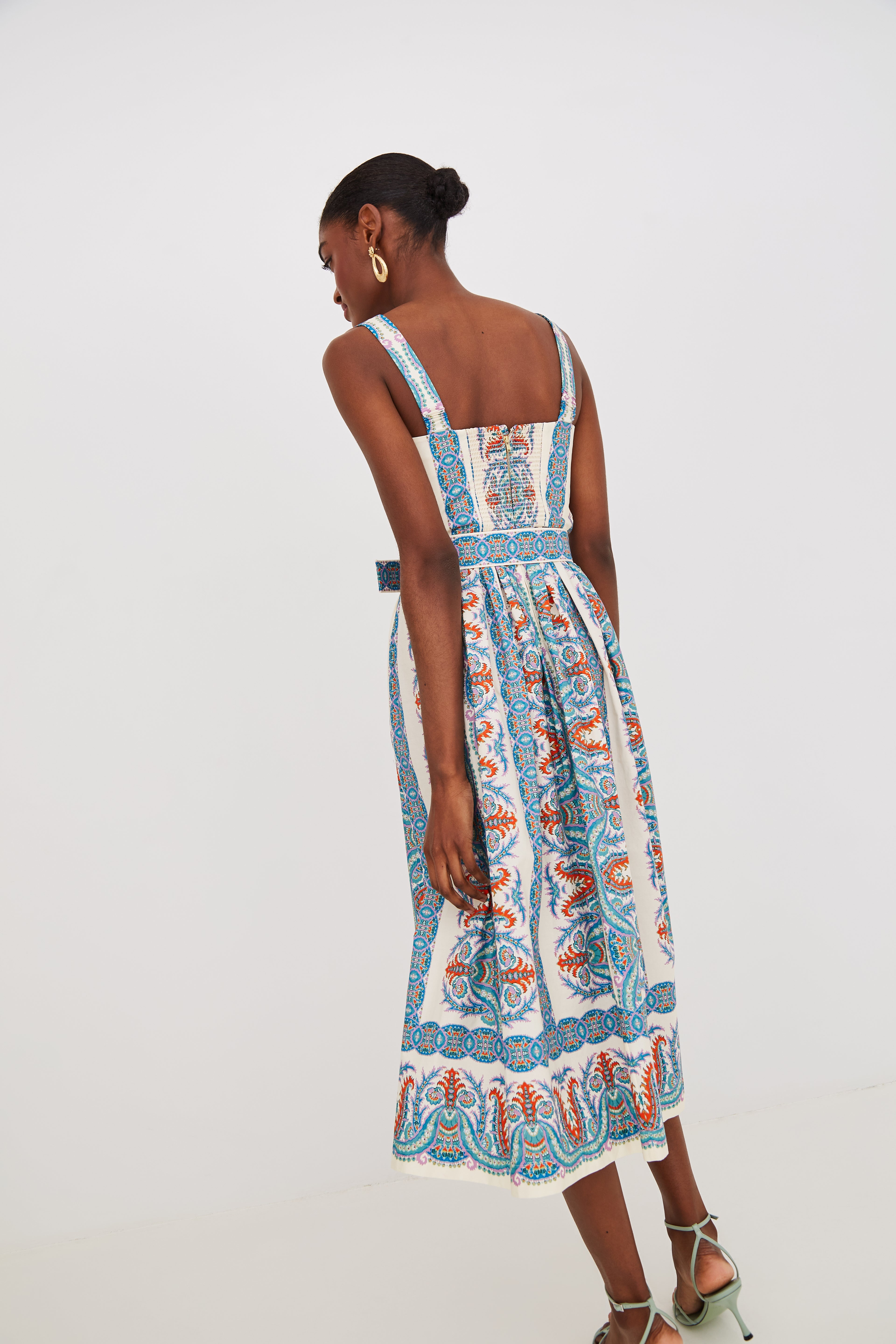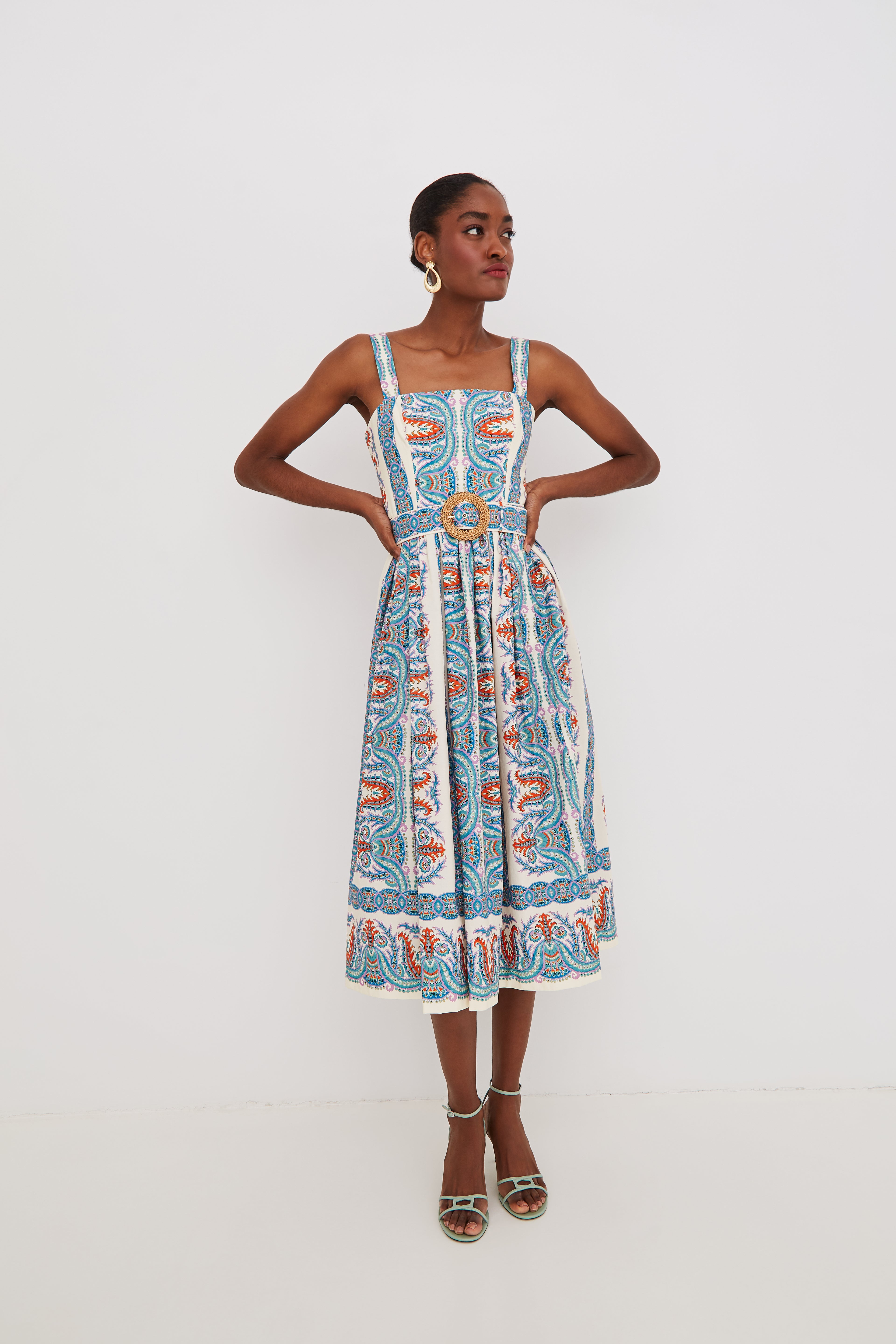 • Removable belt has decorative raffia belt buckle and placed print with loops at waist