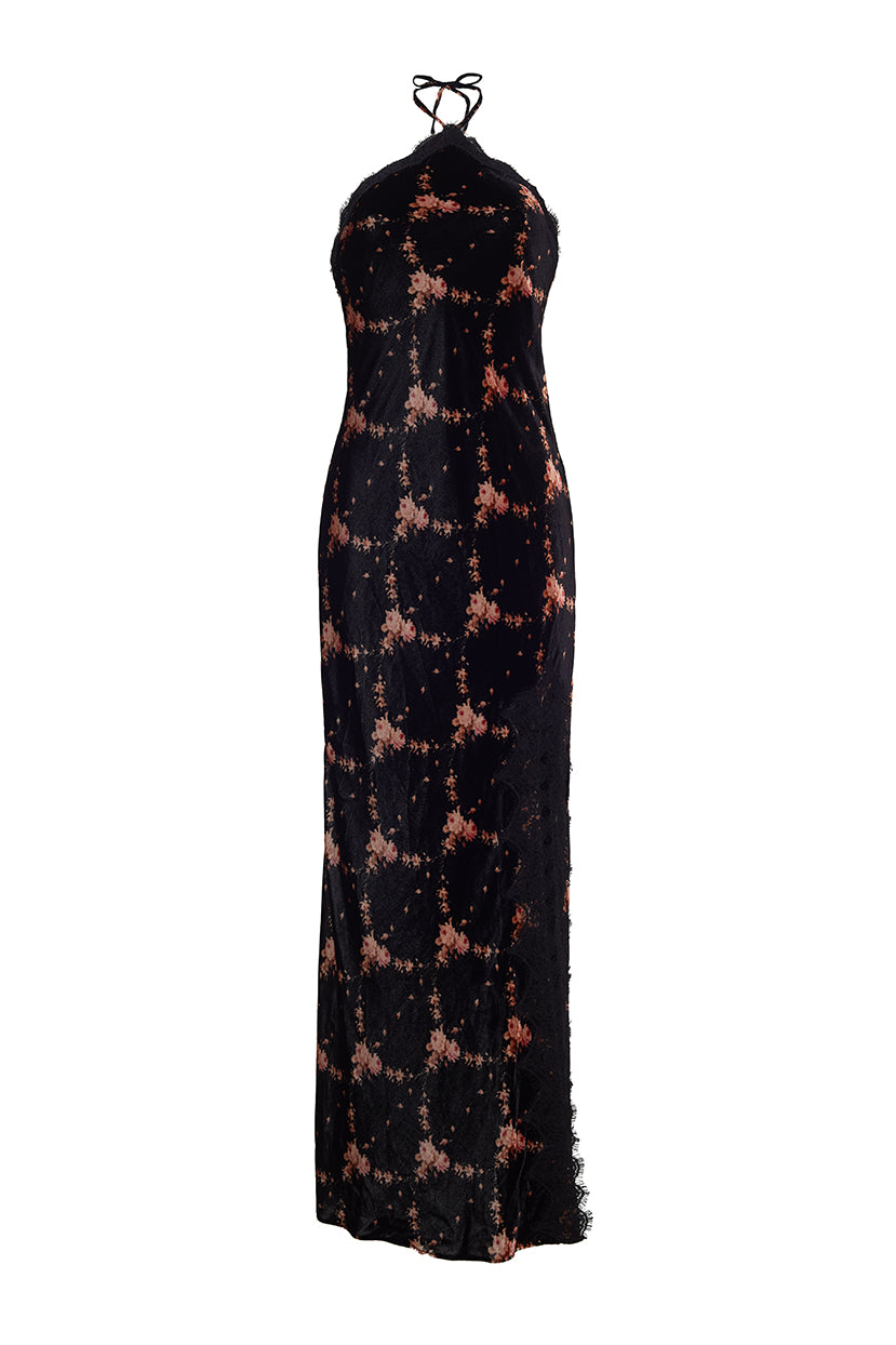 • Bias halter maxi dress in silk velvet with lace adorning the halter neckline and slits at skirt