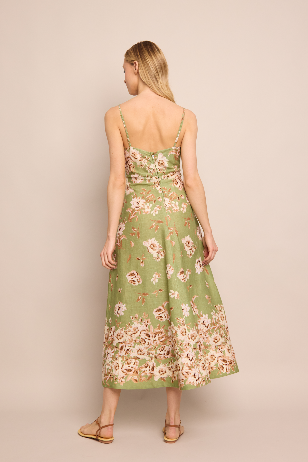 • V-neck spaghetti strap, fit-and-flare midi dress