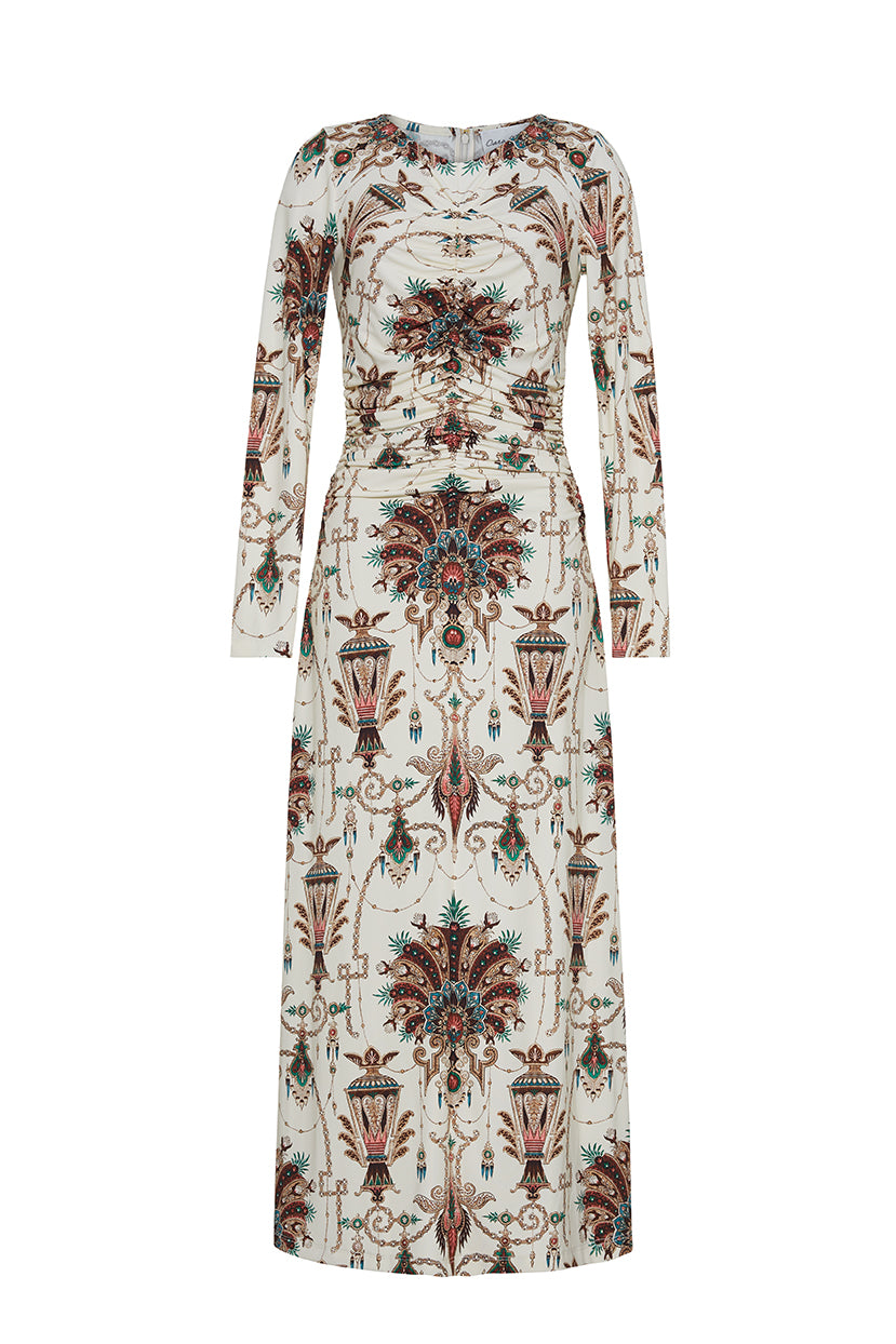 The Maisy Dress emulates chic freshness with a bold print. Rendered in sustainable slinky jersey, this flattering A-line midi’s ruched bodice and lean sleeves offer day-into-cocktail versatility for every occasion.