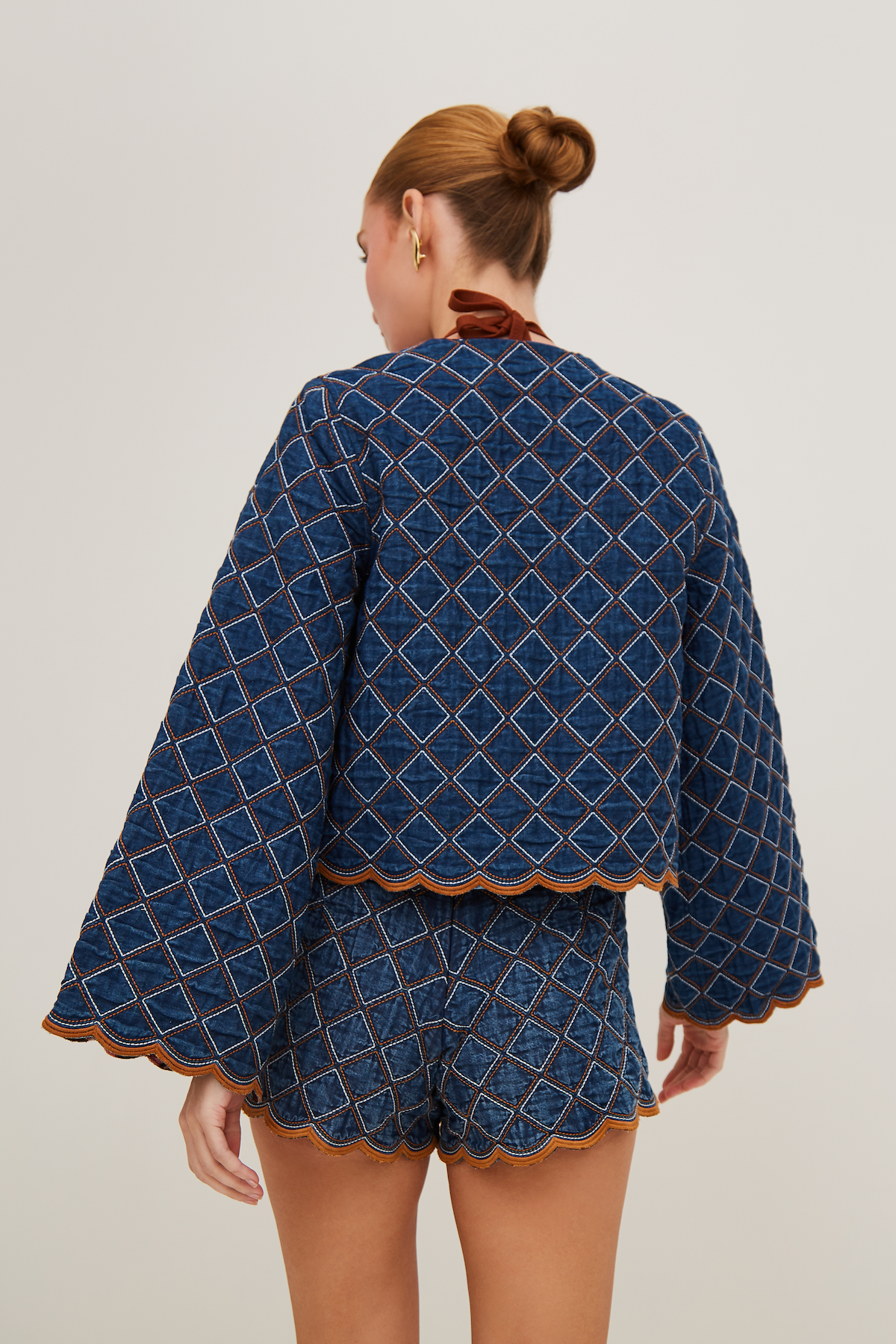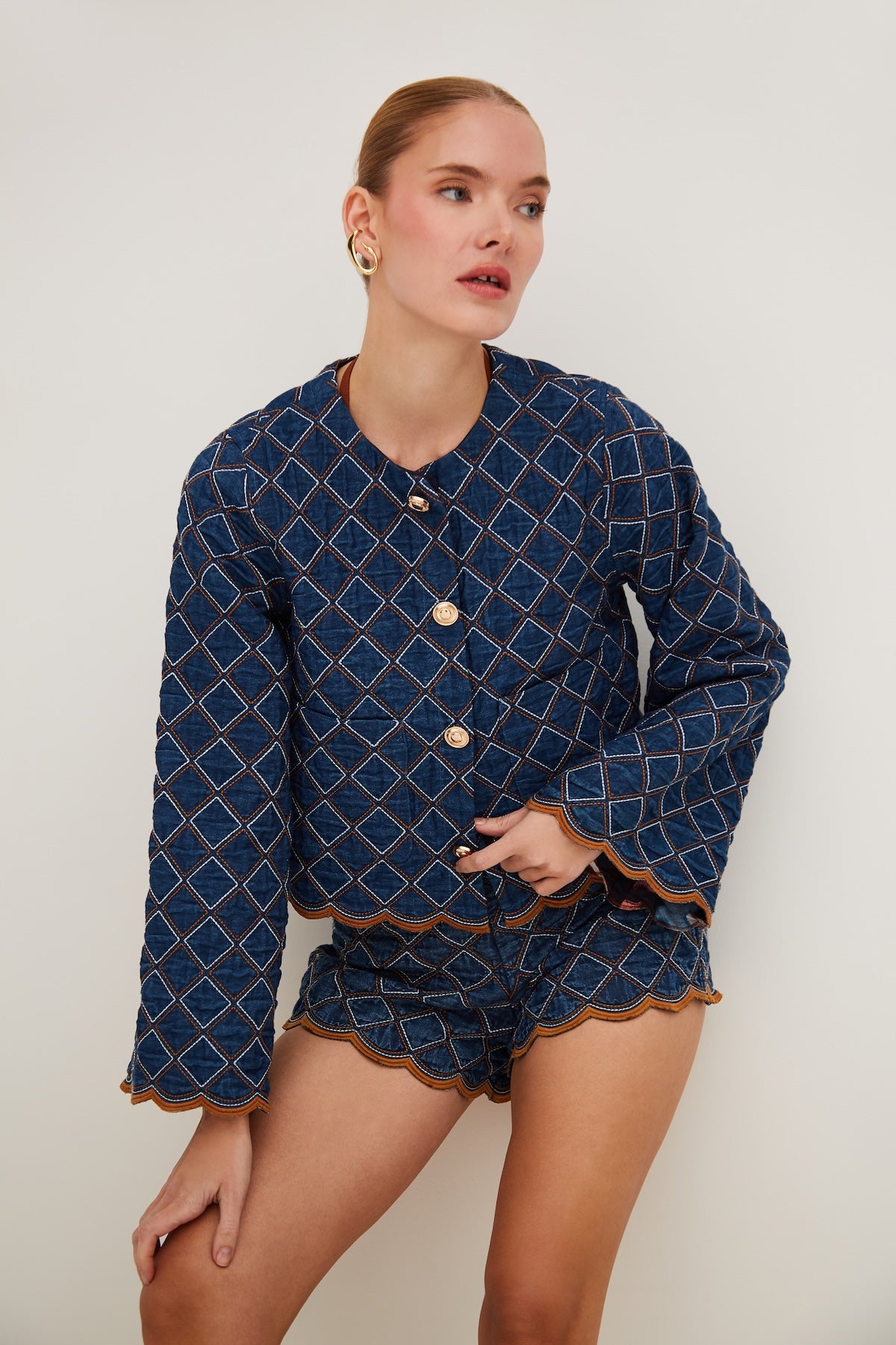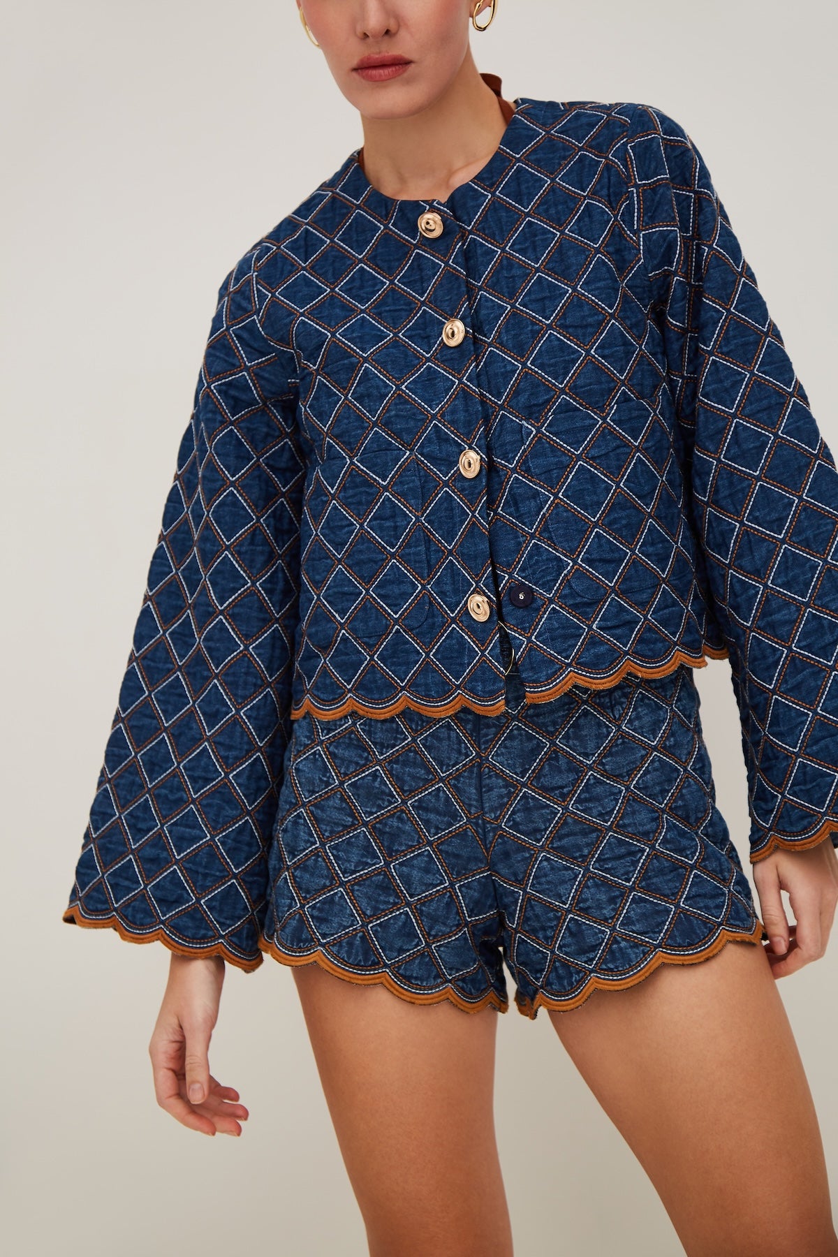 • Cropped quilted denim jacket with wide sleeve openings and scallop edge trim at hem and bottom of sleeve