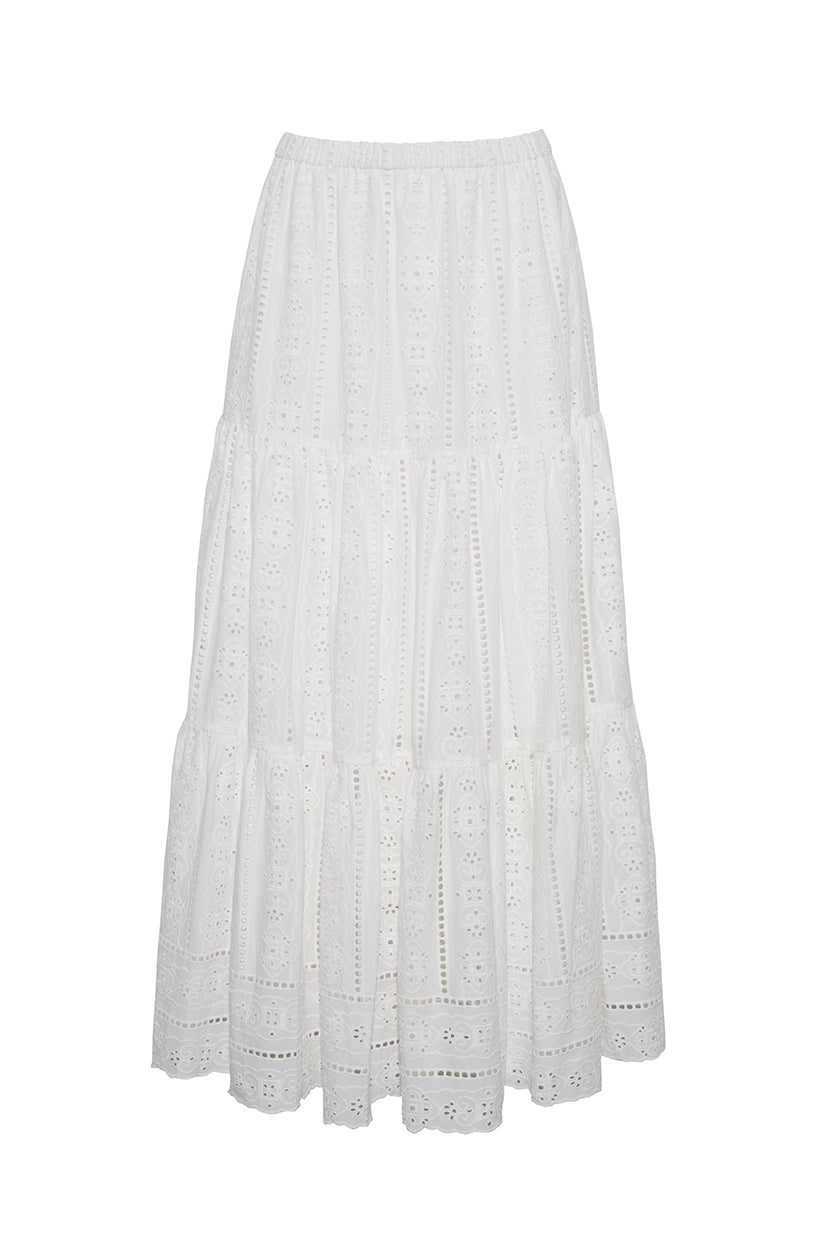 The Melanie is perhaps our most effortless skirt. The elastic waist and tiered silhouette flatter the figure and provide multiple styling options. Pair with our matching Perrin Top in the same eyelet for a fresh resort look or dress down with a white tee and kicks.