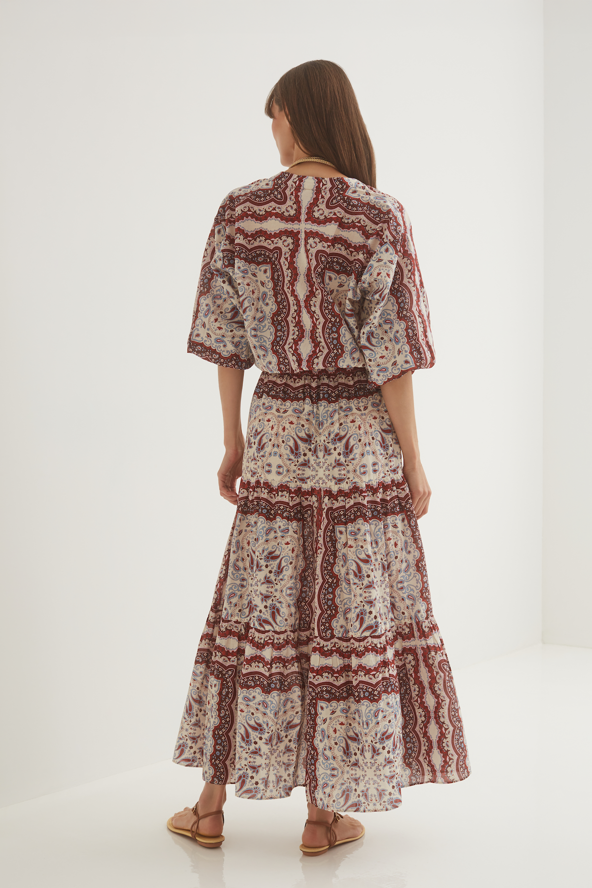 The Melanie in cotton voile is perhaps our most effortless skirt. The elastic waist and tiered silhouette flatter the figure and provide multiple styling options. Pair with our matching Perrin Top in the same print for a fresh look or dress down with a white tee and kicks.