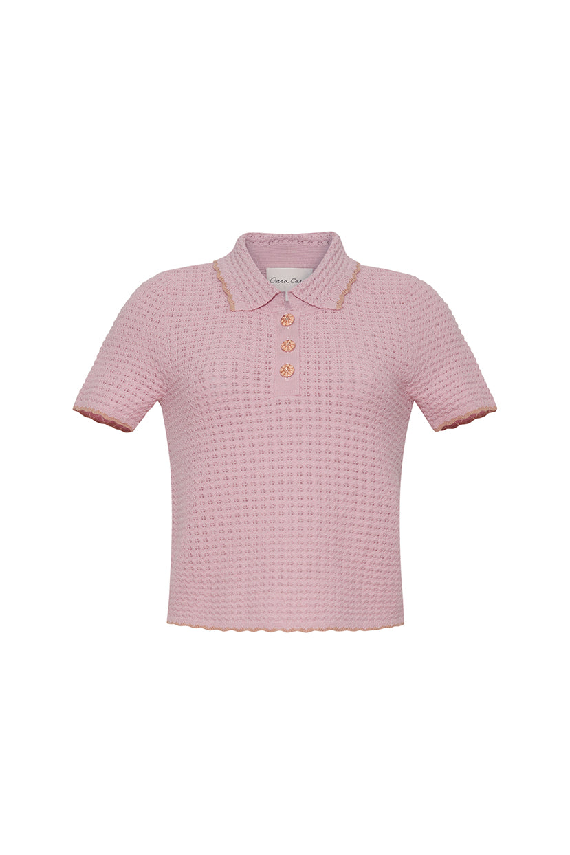 • Shrunken pointelle stitch short sleeve polo with contrast tipping and functional button placket