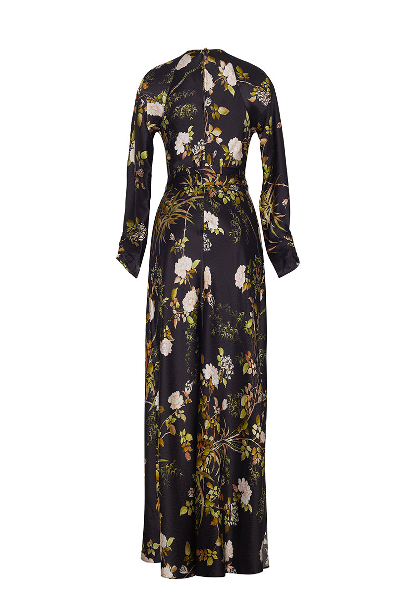• Long sleeve maxi column dress with side slits and self sash to tie around waist