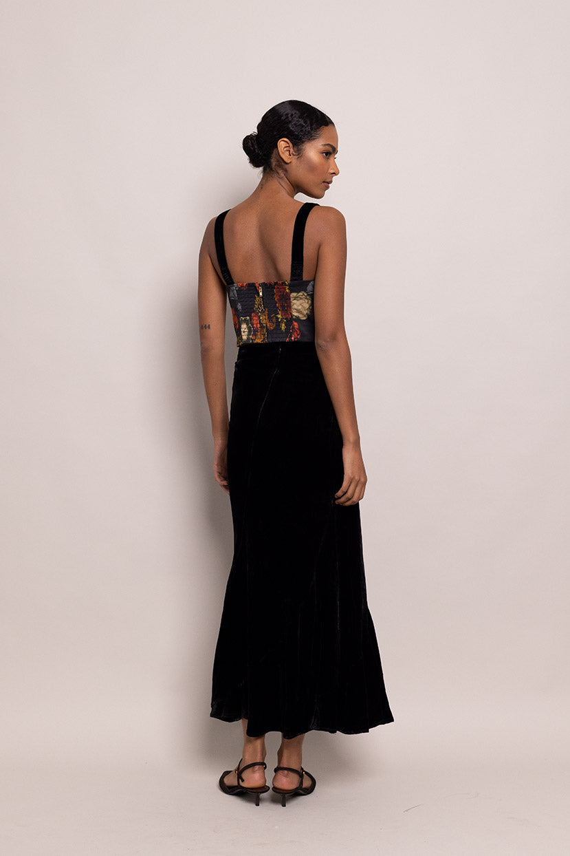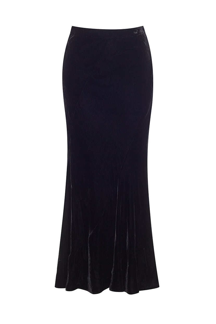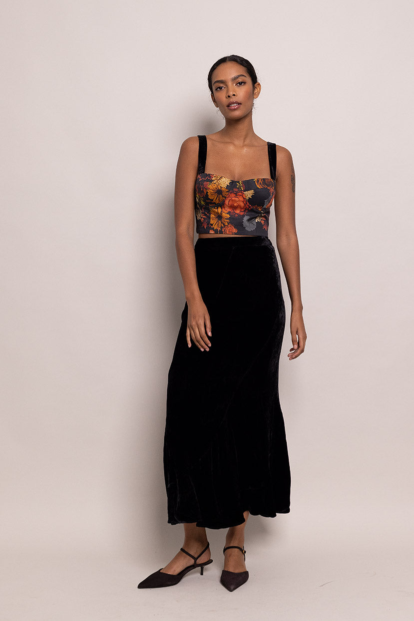 The Naomi Skirt is an elegant classic with clean lines and a fluid, graceful skirt. Black silk velvet makes for a versatile staple with an air of 1940s-inspired glamour. For a simple evening look with a dash of feather-embellished fun, pair with our Cassidy Top.