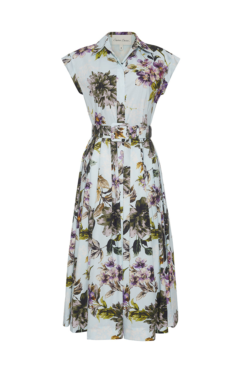• Drop-shoulder, fit-and-flare, midi, belted shirtdress