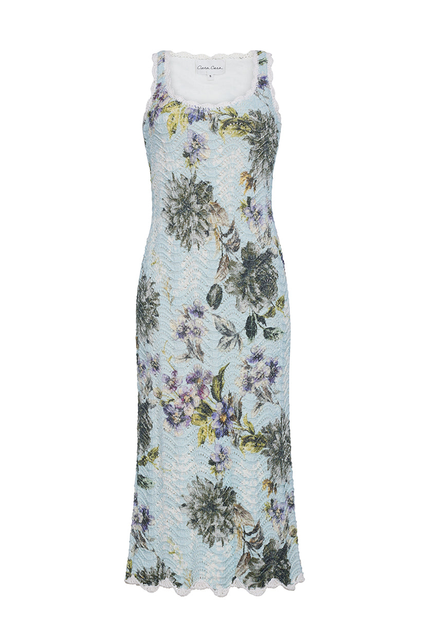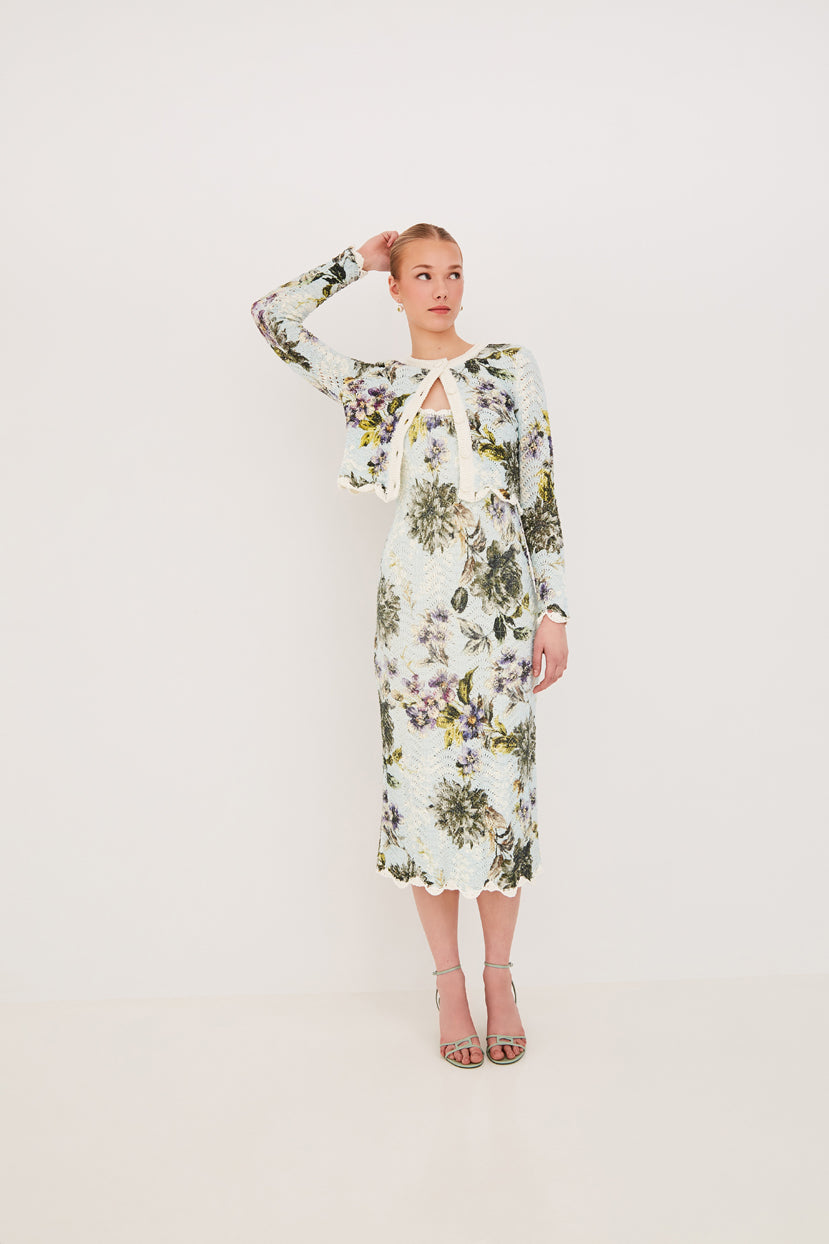 • Botanical printed cotton crochet dress with hand crochet trims with floral allover print