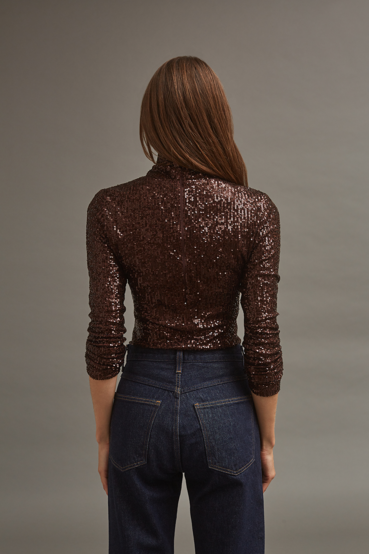 Our Piper Top is a luxe turtleneck in a bold brown sequin. Brilliant for cold weather layering to add sophistiation to any winter occasion. The Piper is perfect for tucking into trousers or teaming with a chic blazer.