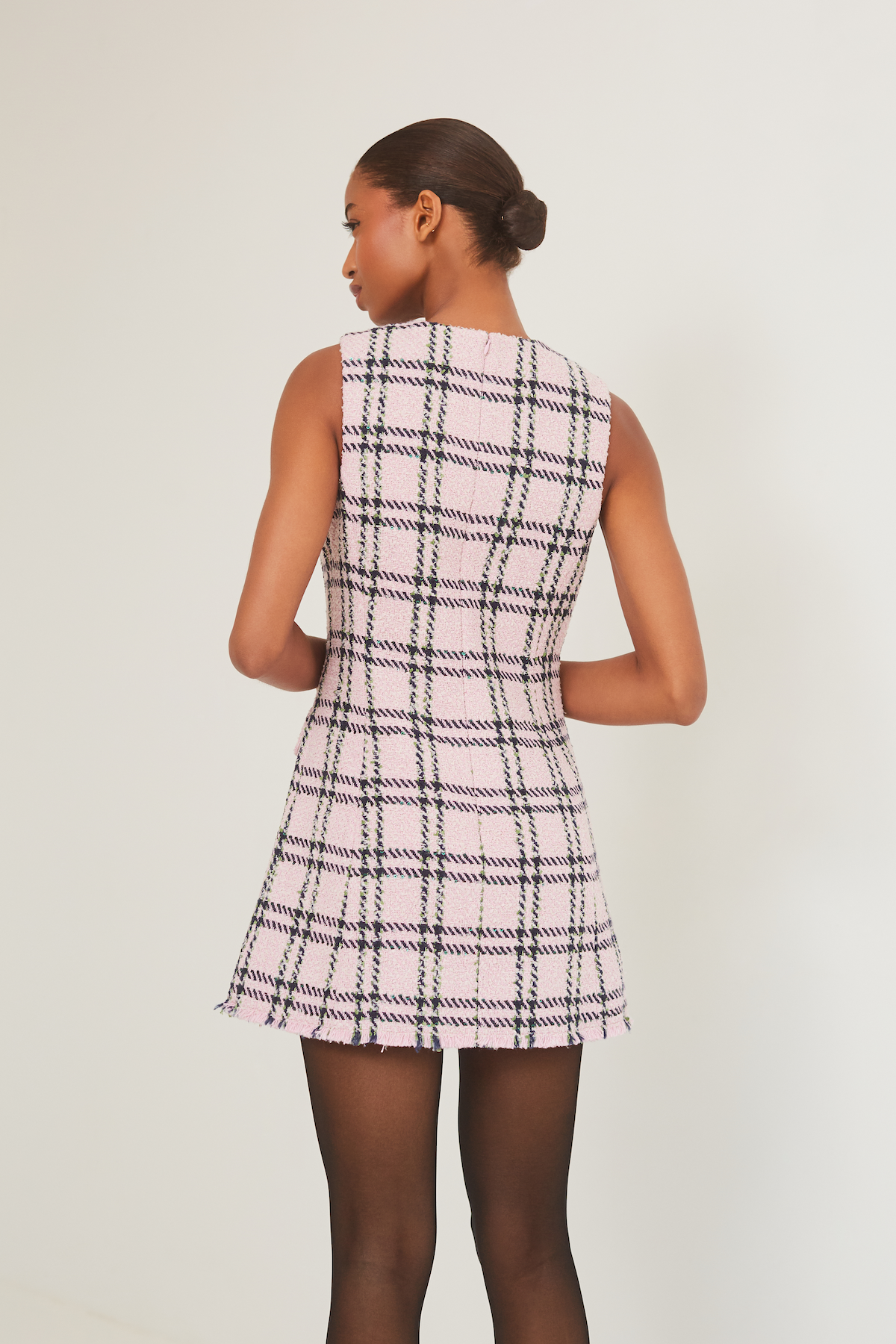 • Scoopneck fitted mini dress in pink boucle tweed with frayed edge at hem