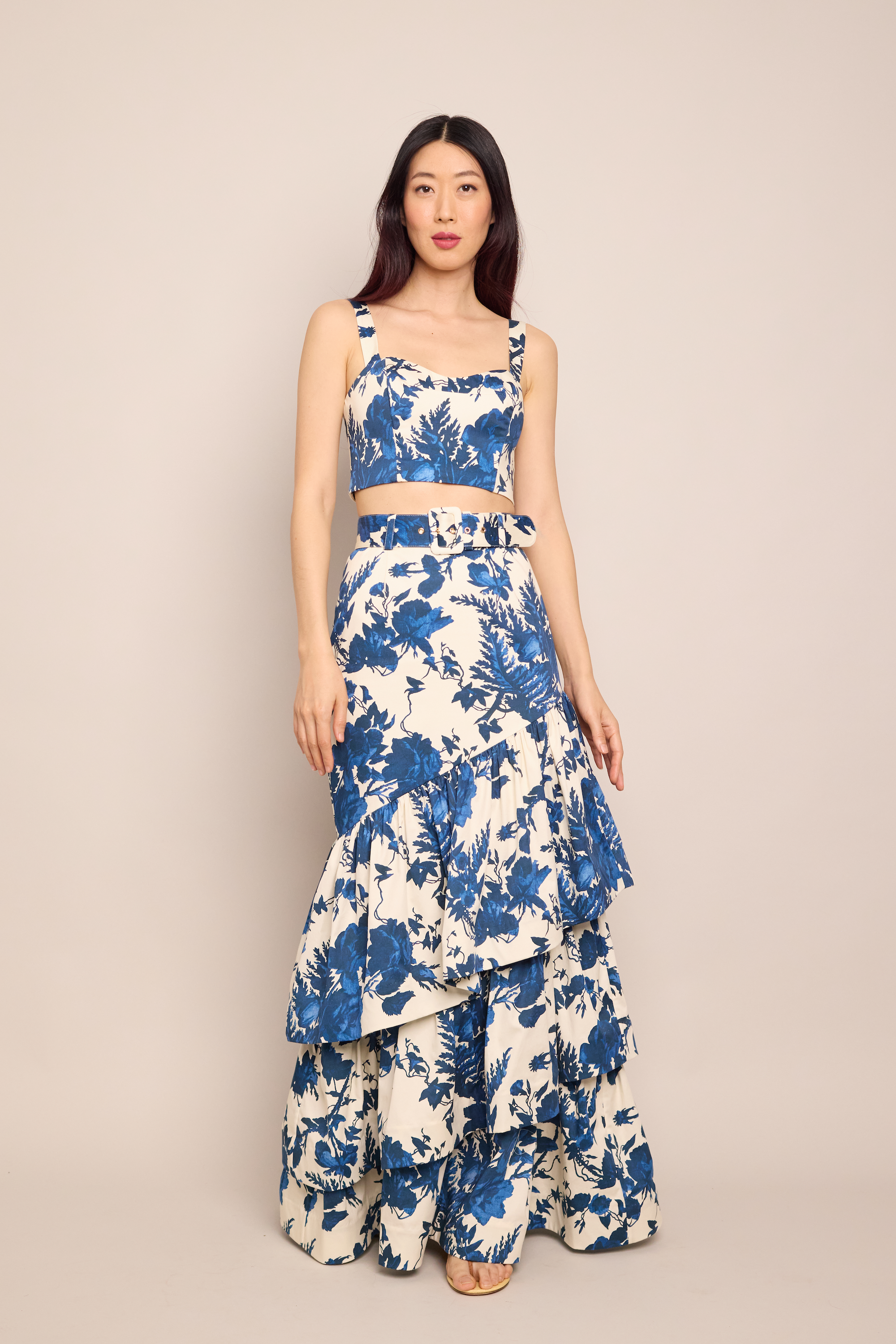 • Maxi asymmetrical fitted skirt with voluminous ruffles at tiers
