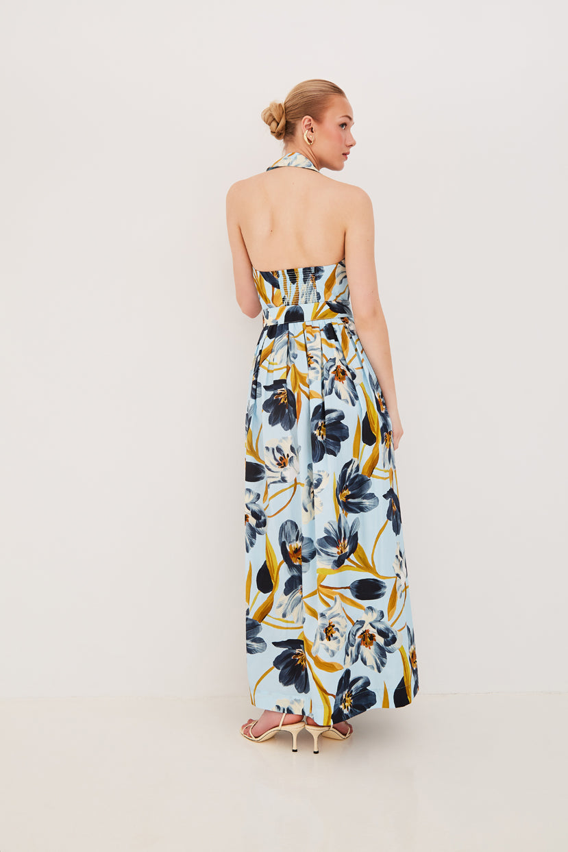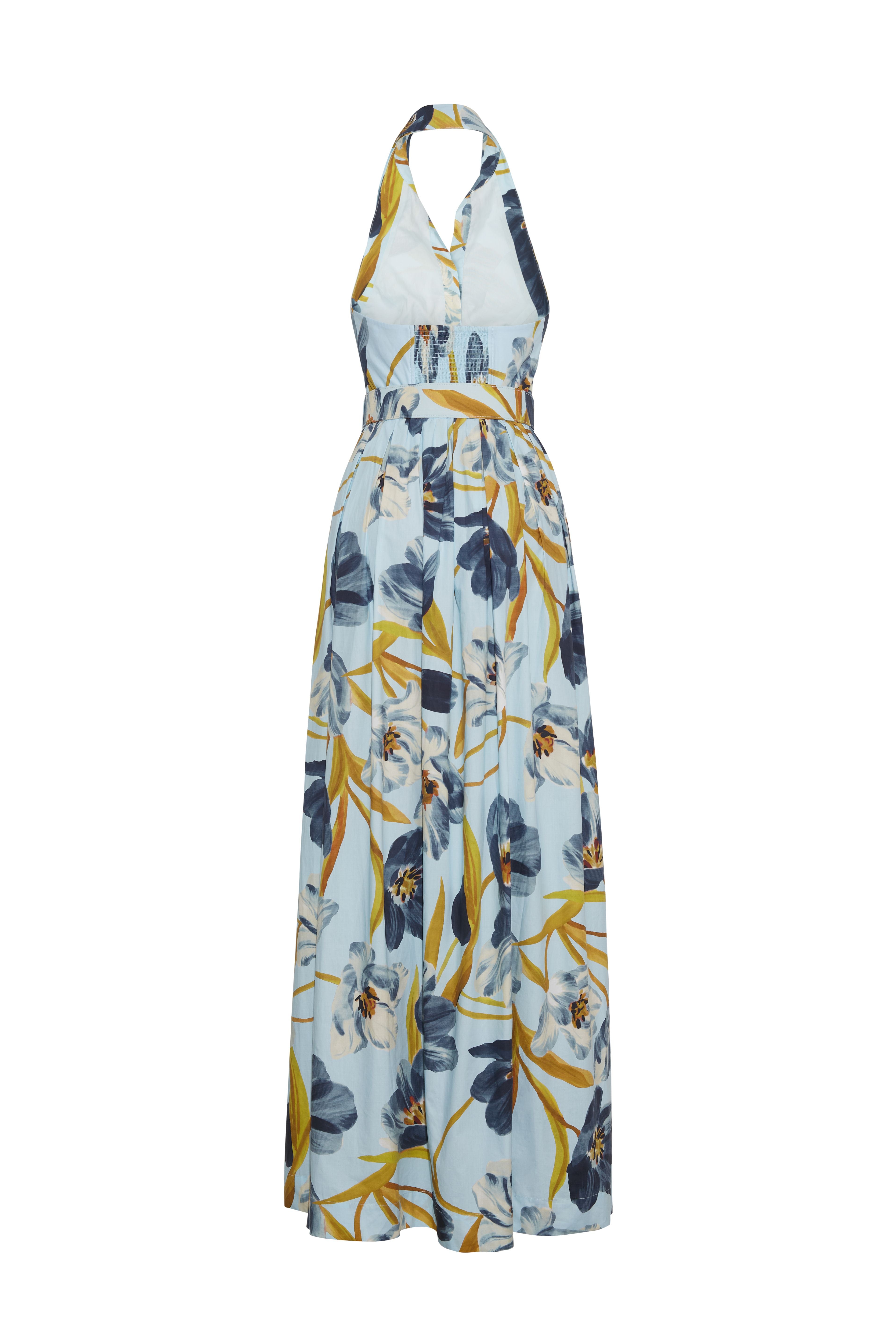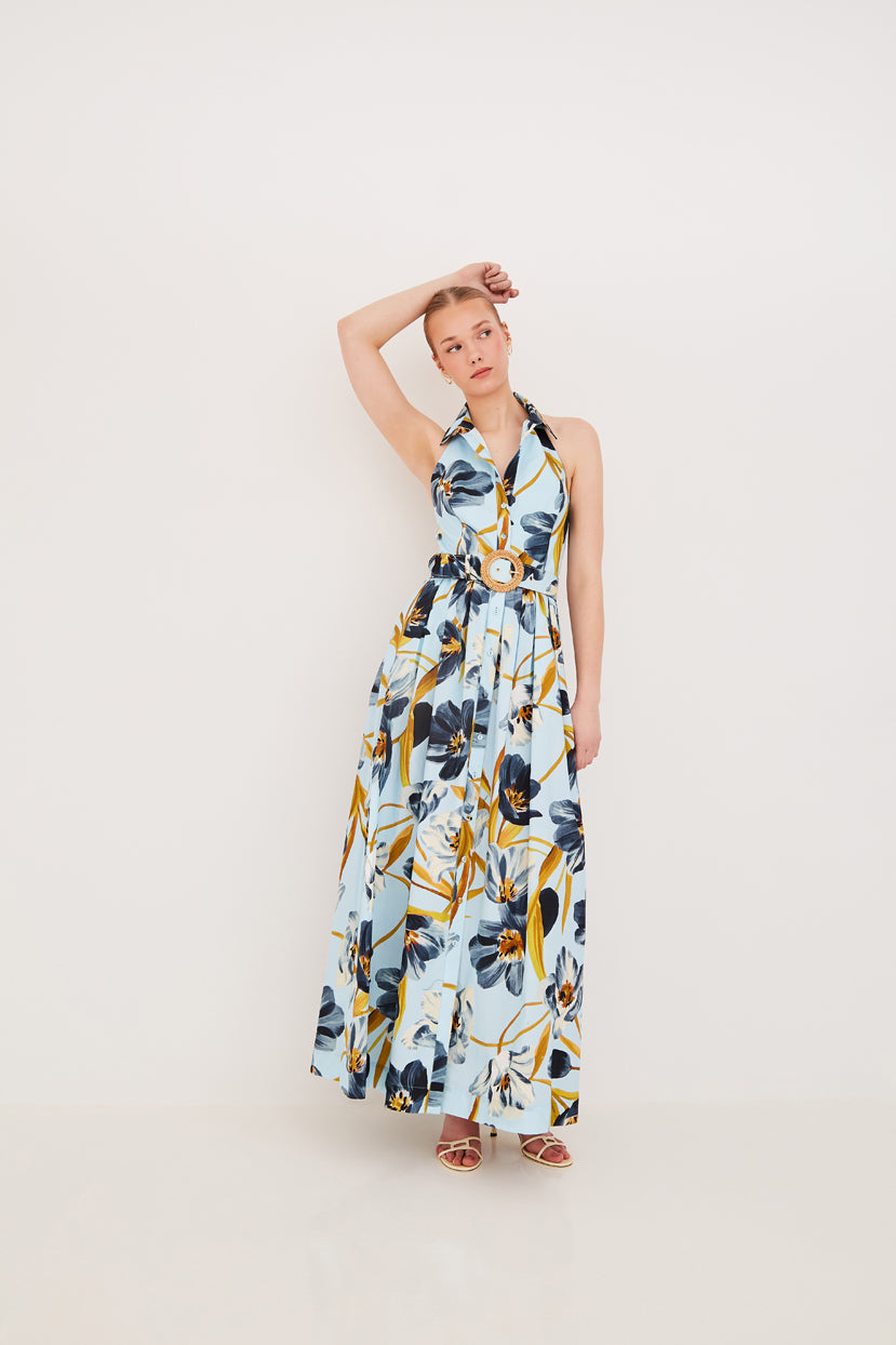• Collared button down halter maxi dress with belted waist