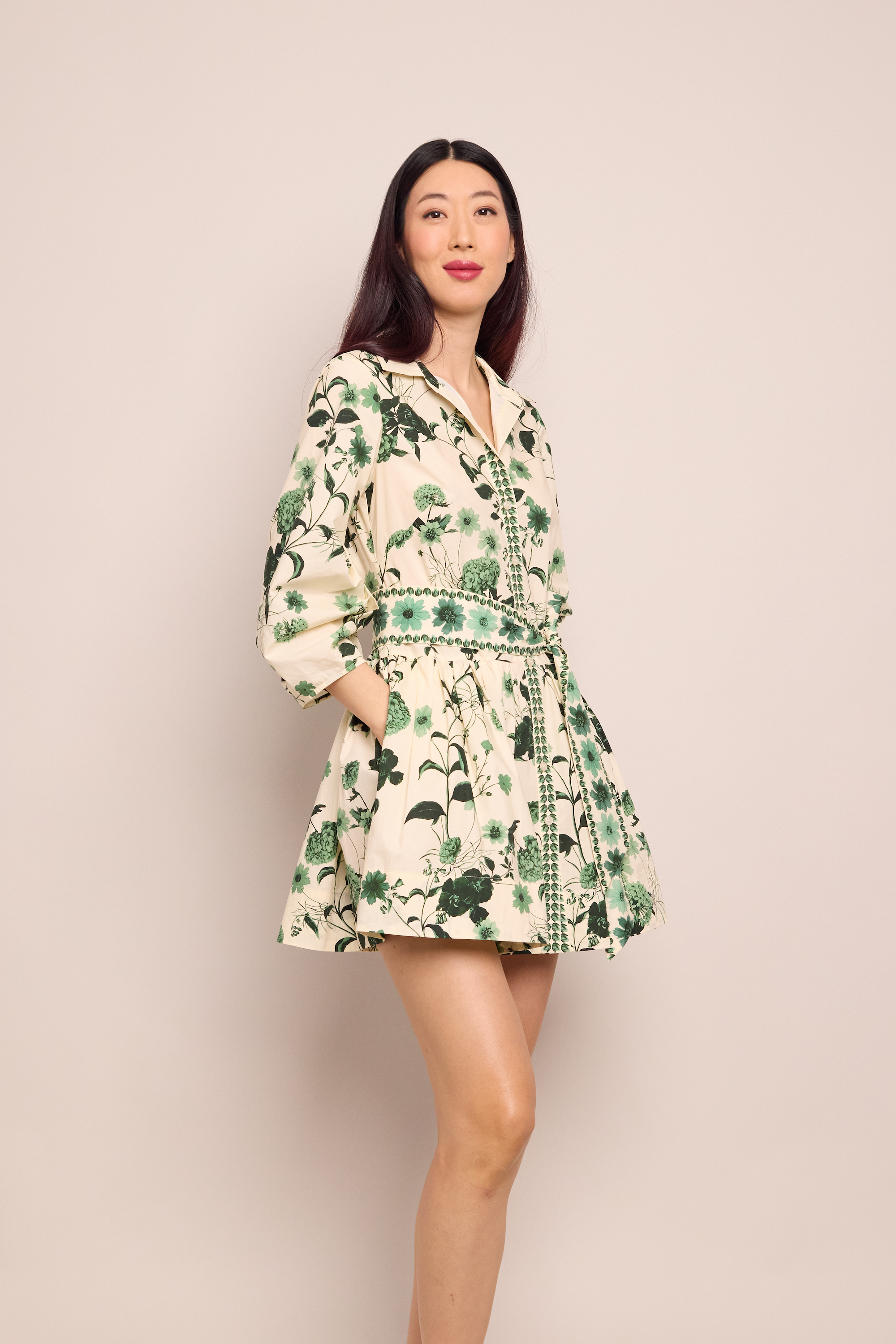 • Placed print at placket sash