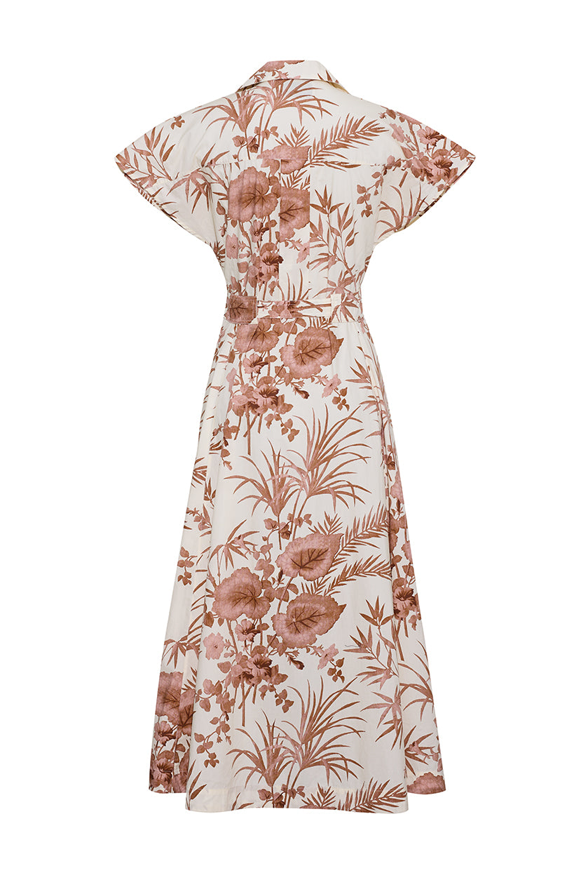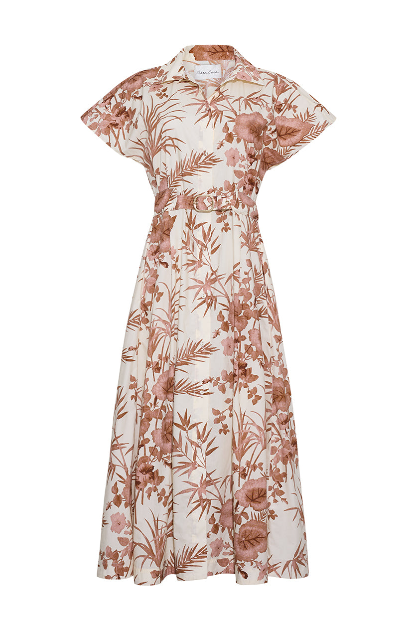 • Collared short sleeve belted a-line midi shirtdress in structured poplin