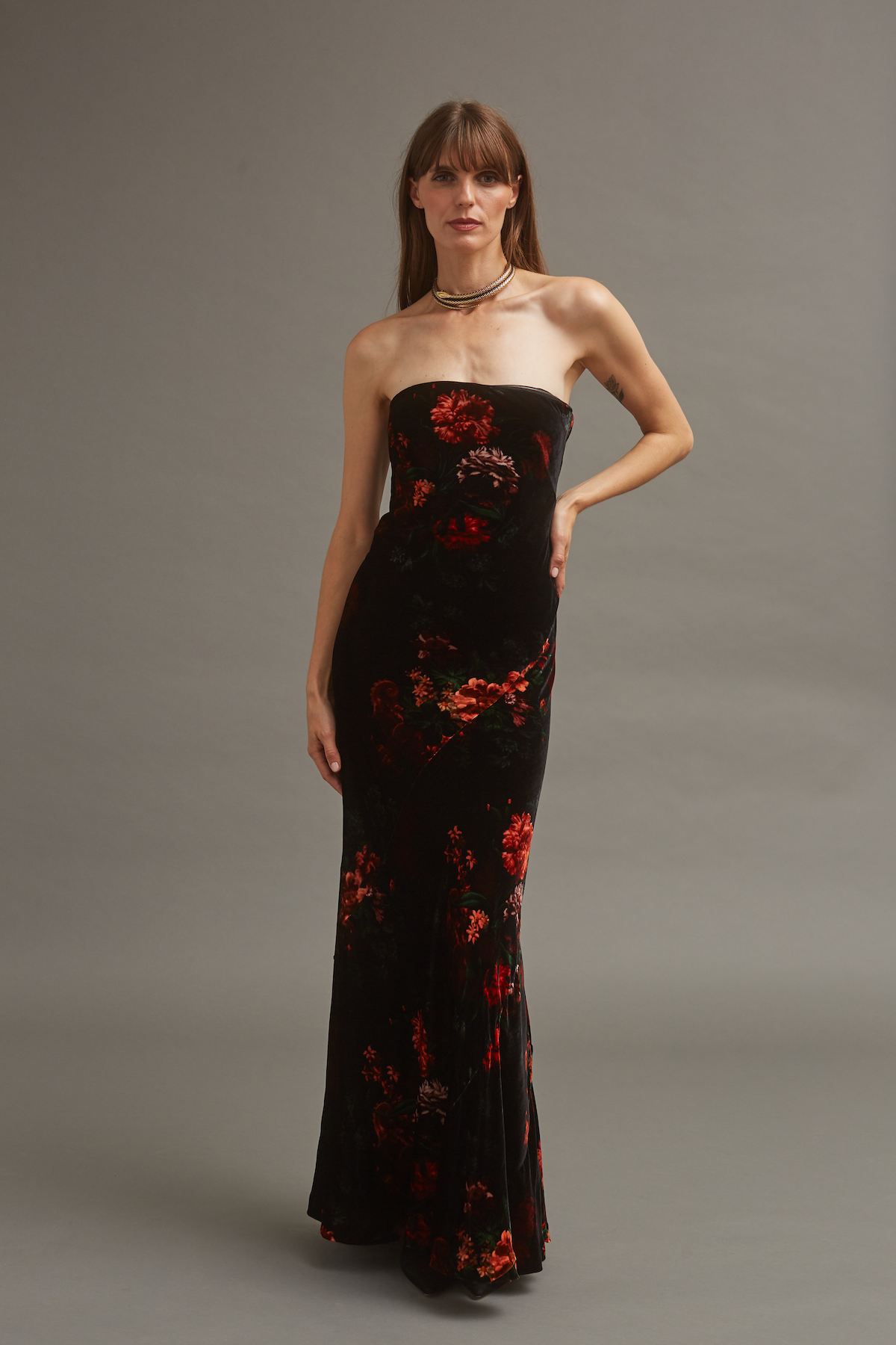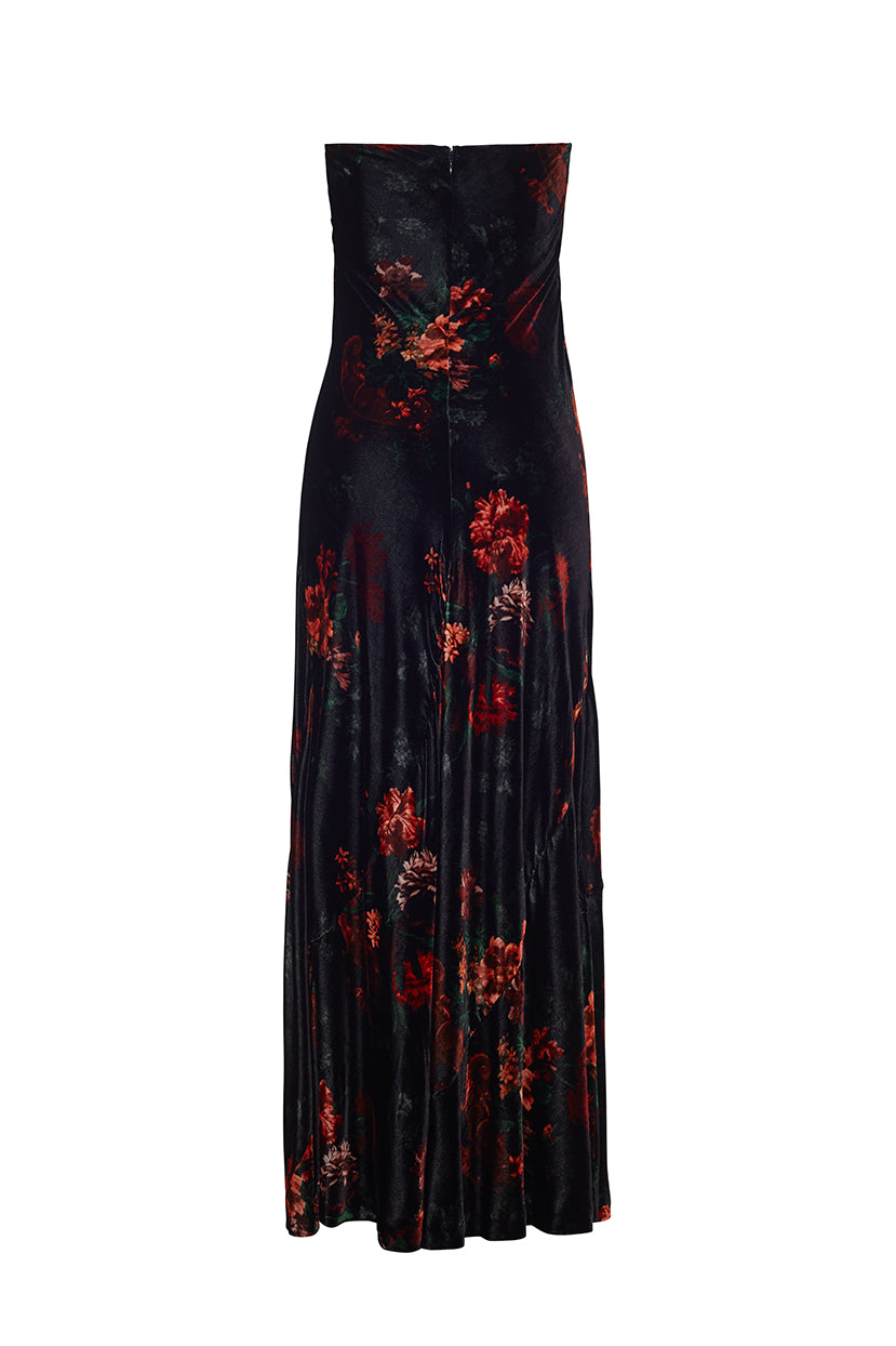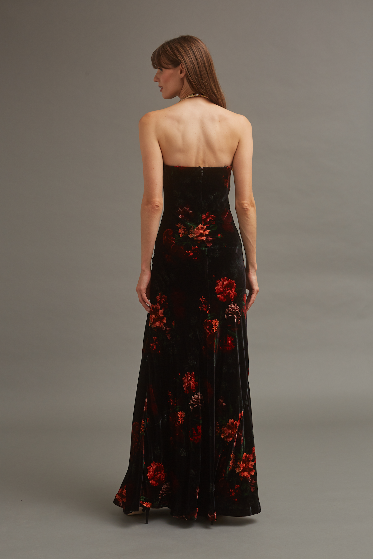 • Strapless paneled velvet maxi dress with internal power mesh corset construction