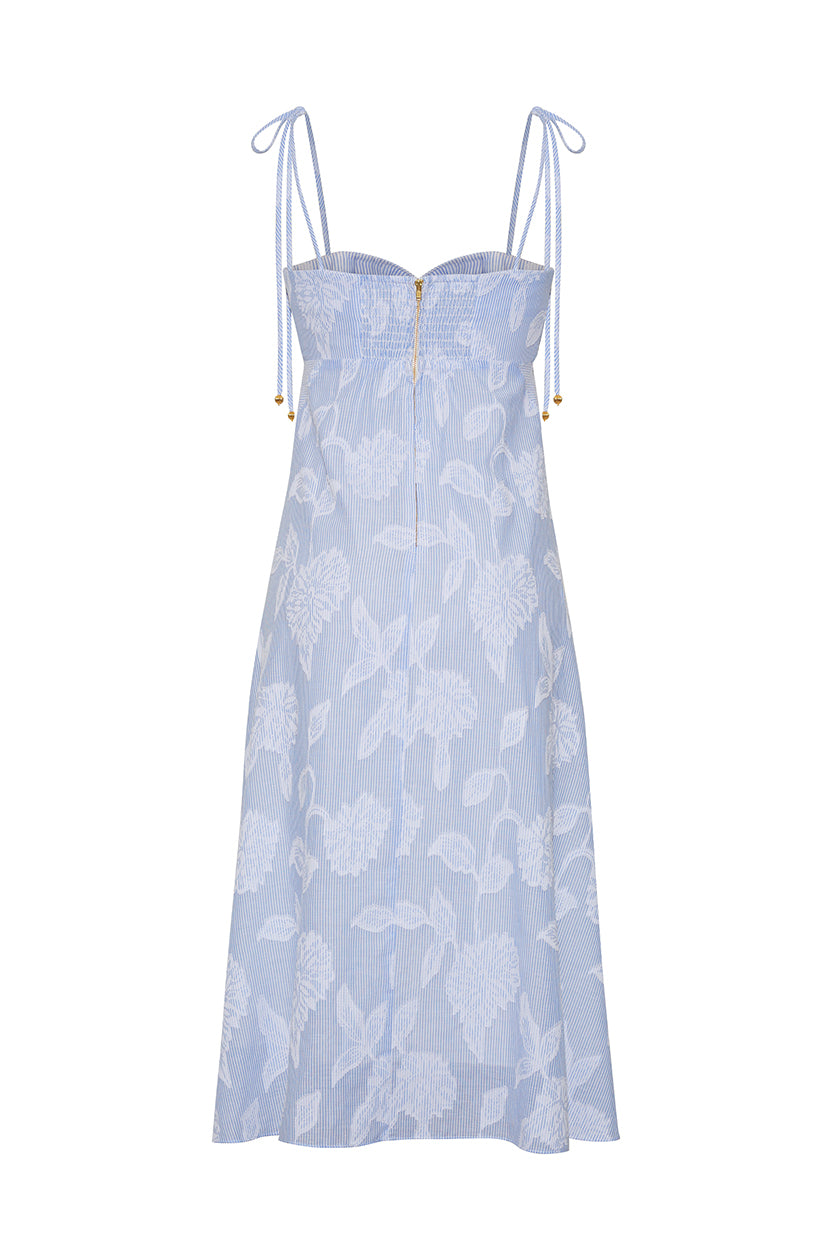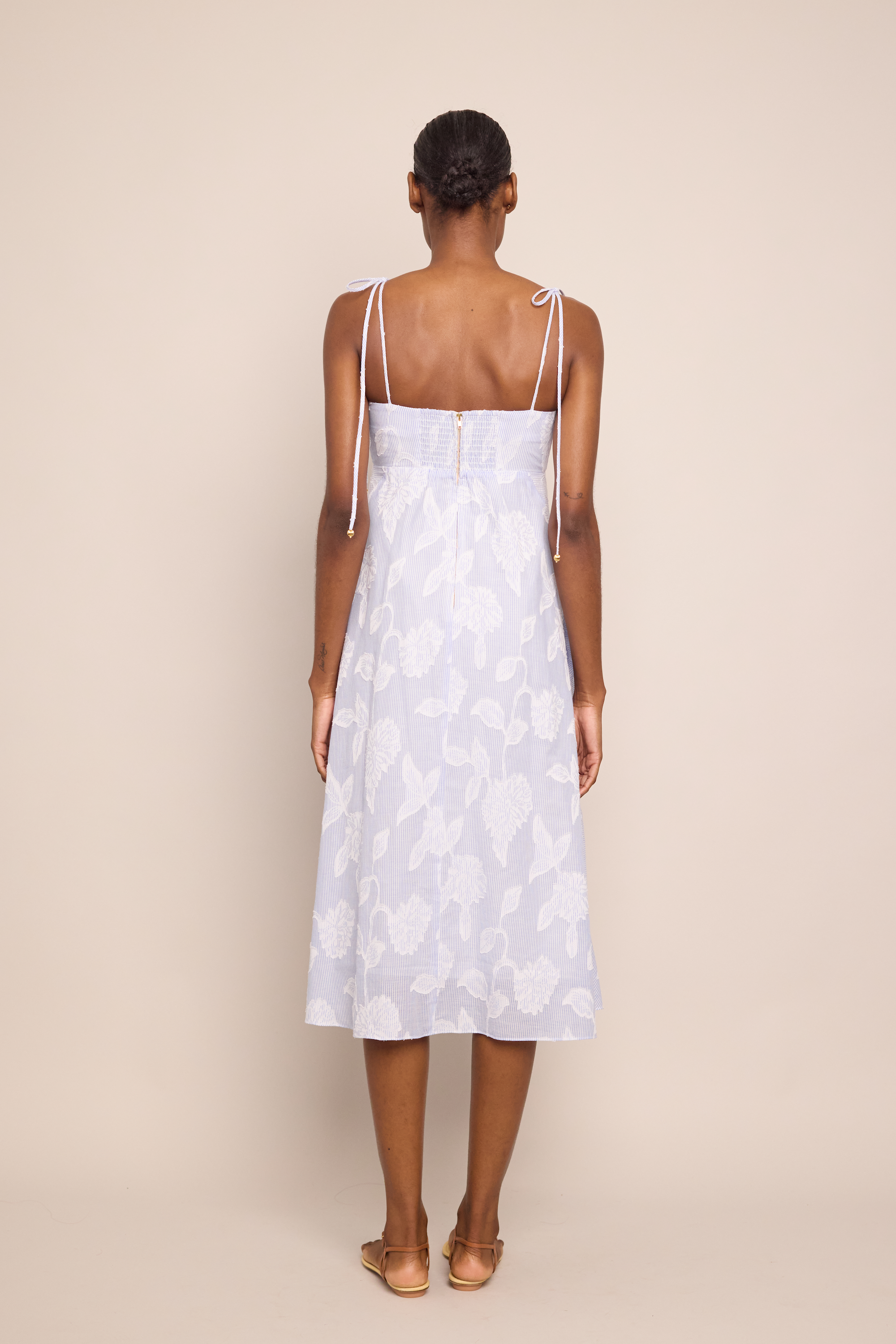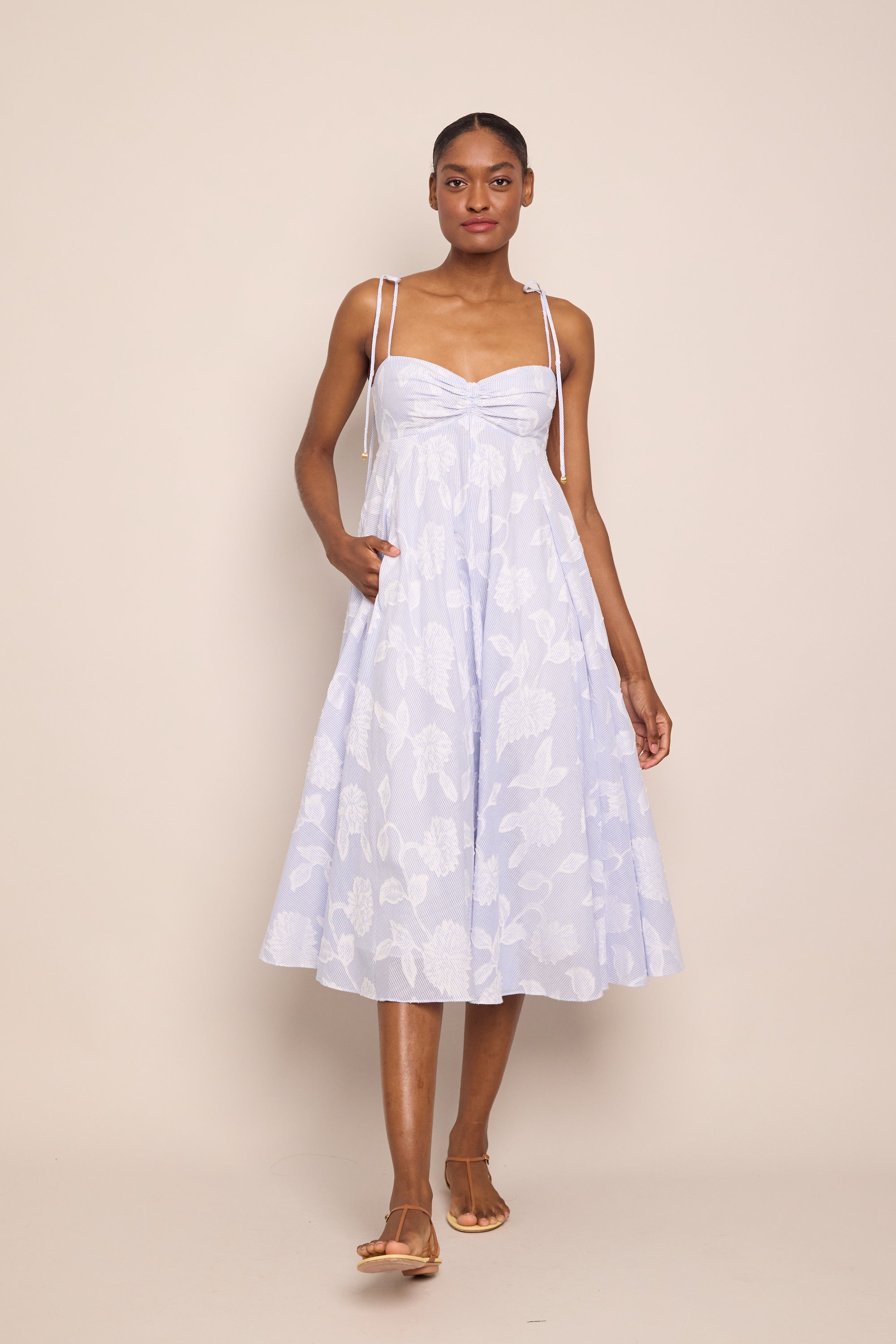 • Midi length dress with circle skirt and ruched bodice designed for a fit-and-flare look