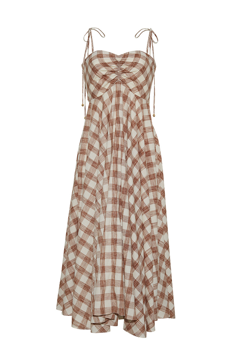 • Midi length dress with circle skirt and ruched bodice designed for a fit-and-flare look