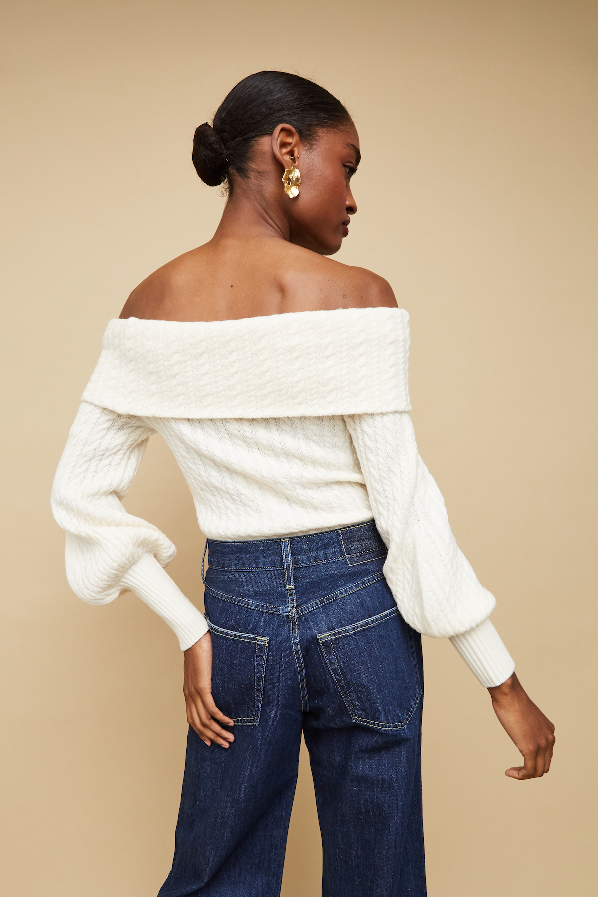 • Roll-over, off-the-shoulder lantern sleeve cable-knit pullover long sleeve sweater