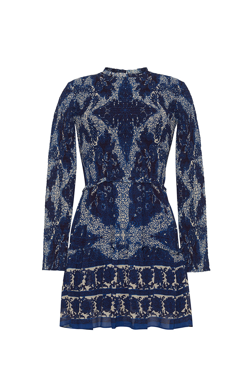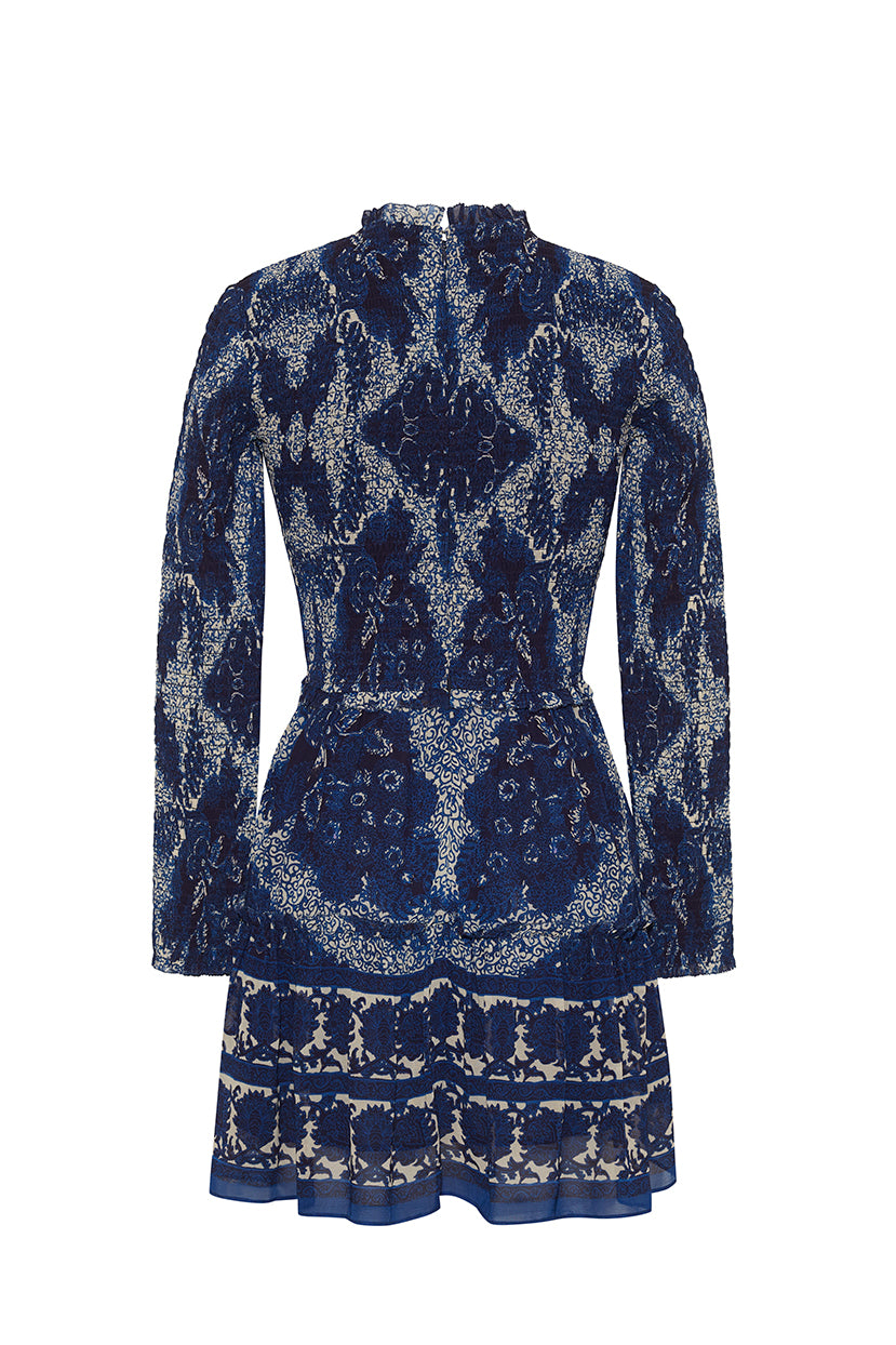 The Viola Dress offers easy autumn luxury. This long-sleeved mini features textural interest in micro-ruffles at the skirt and waist and a smocked front panel with contrast stitching.