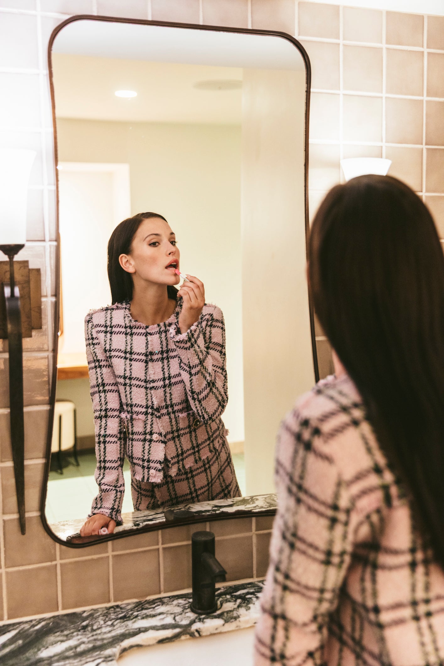 • Boxy jacket in pink boucle tweed with frayed edges at all openings and yoke seam