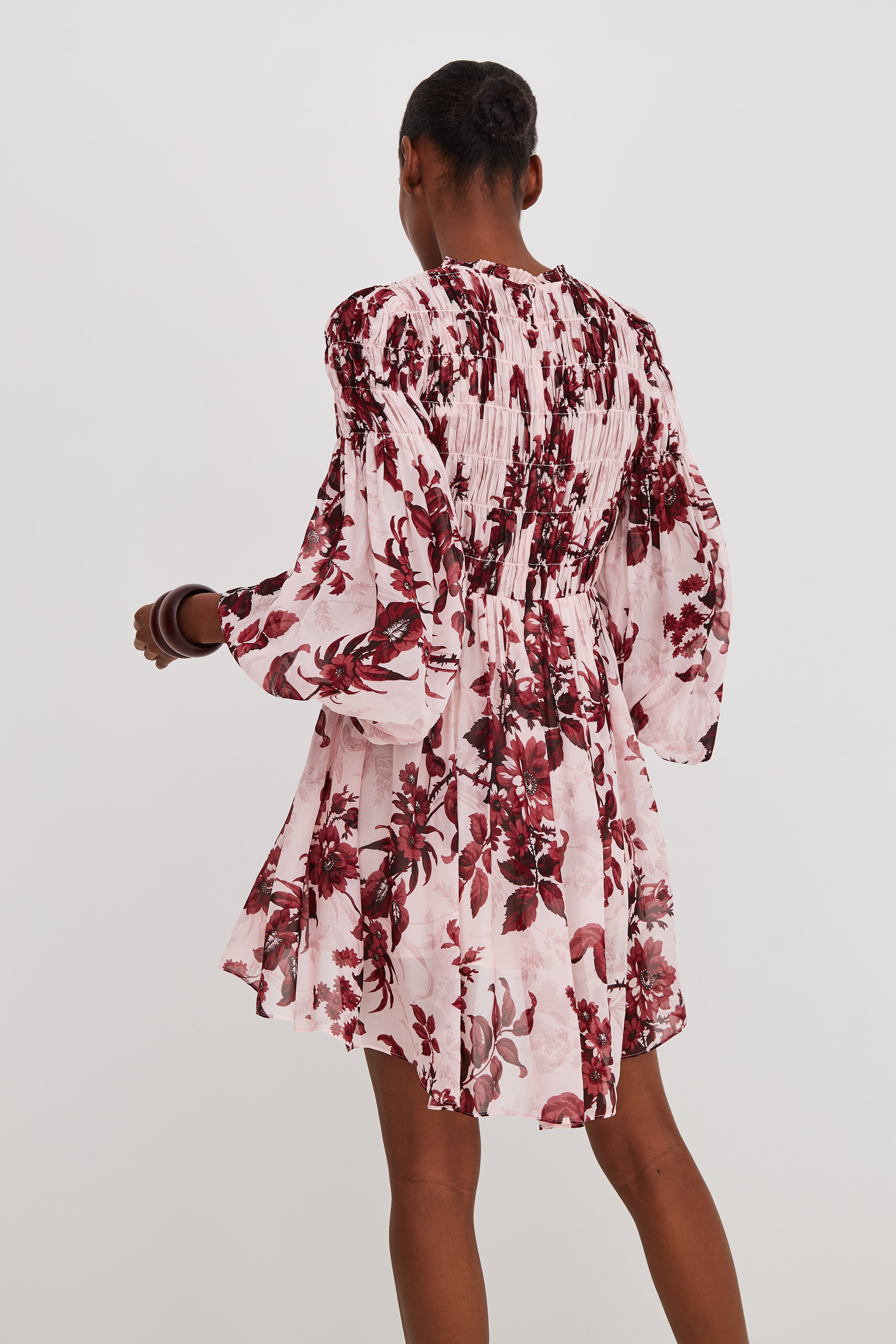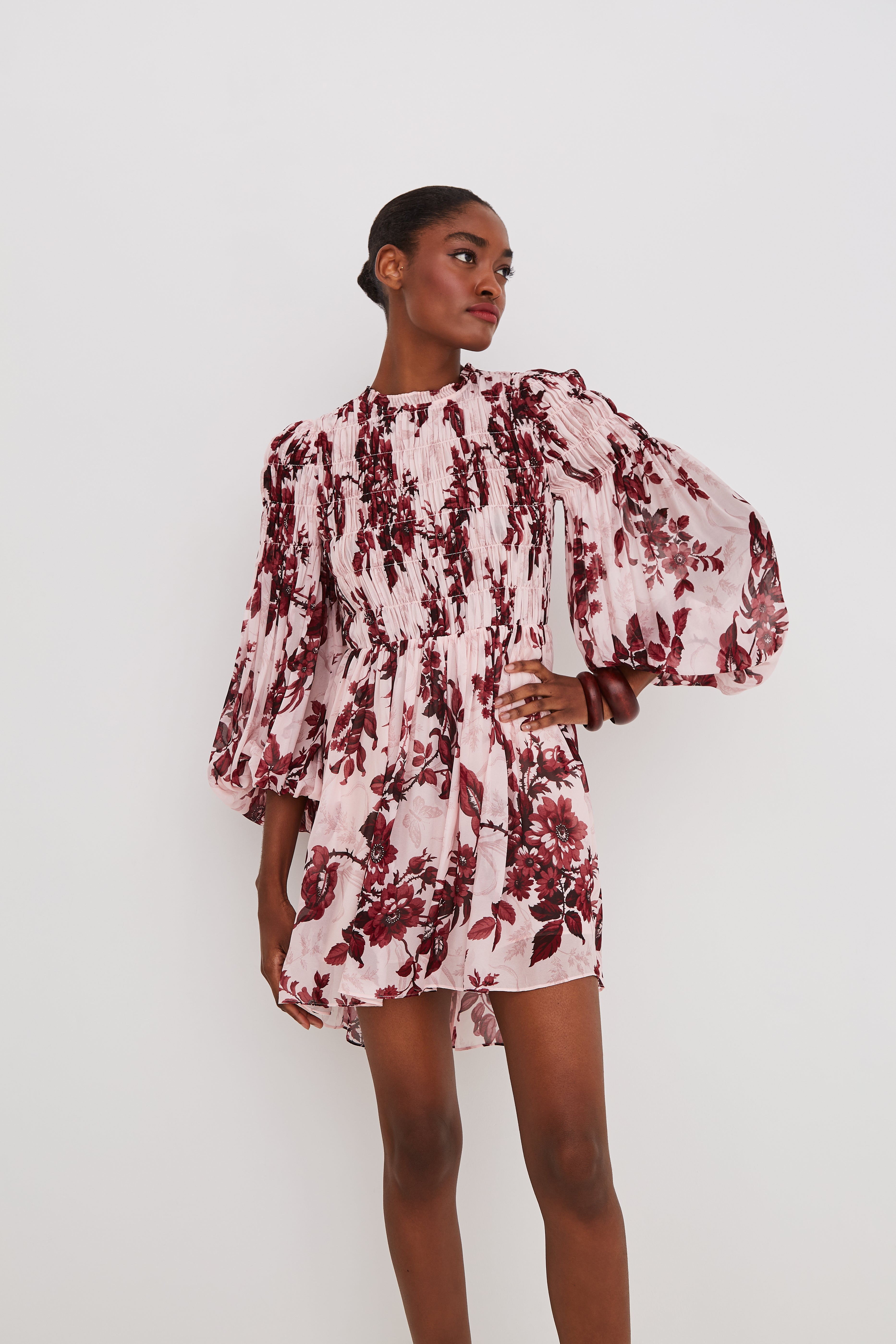 • Sleeve hugging smocking at the sleeve releases into blouson sleeves