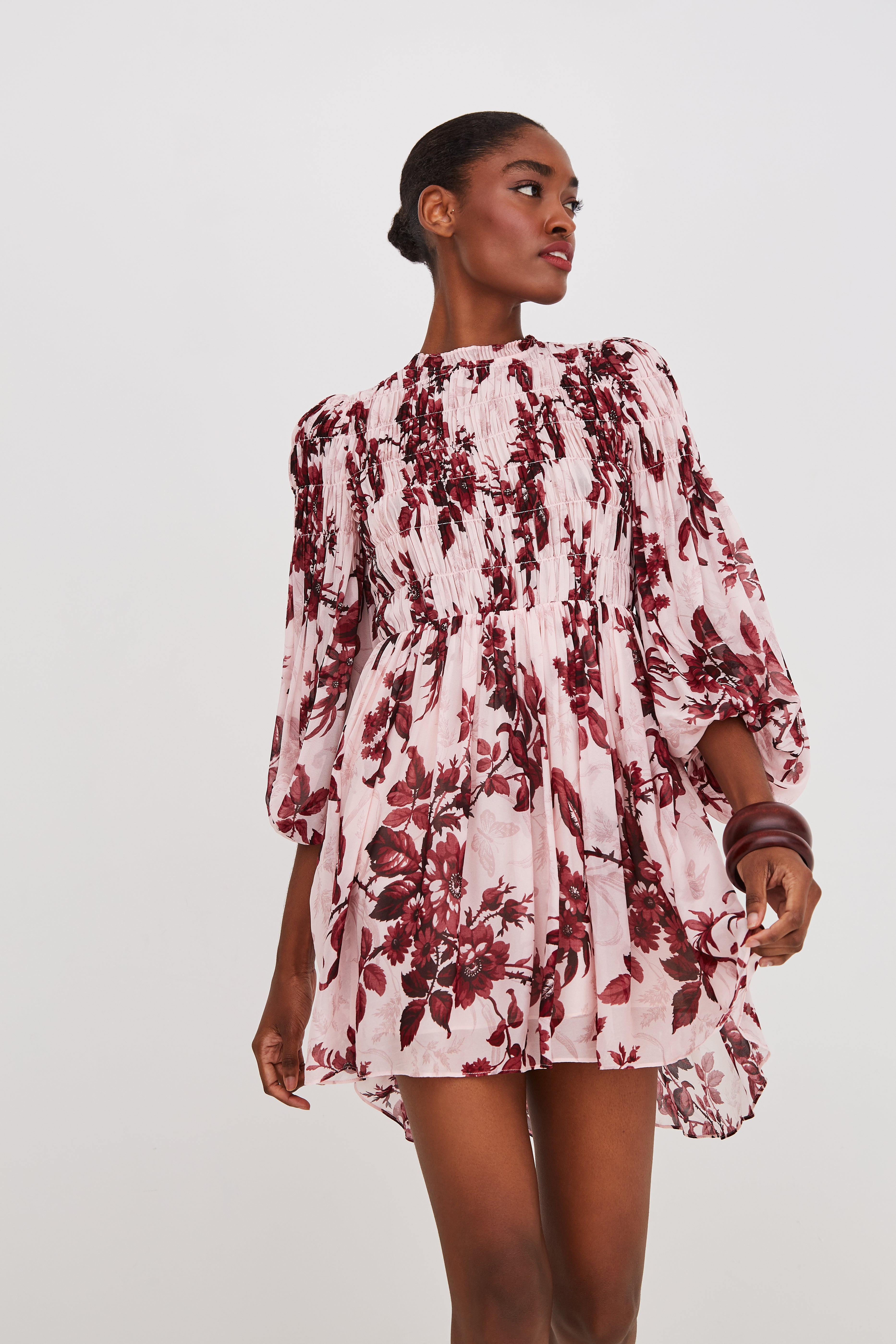 • High-low smocked mini dress with blouson sleeves
