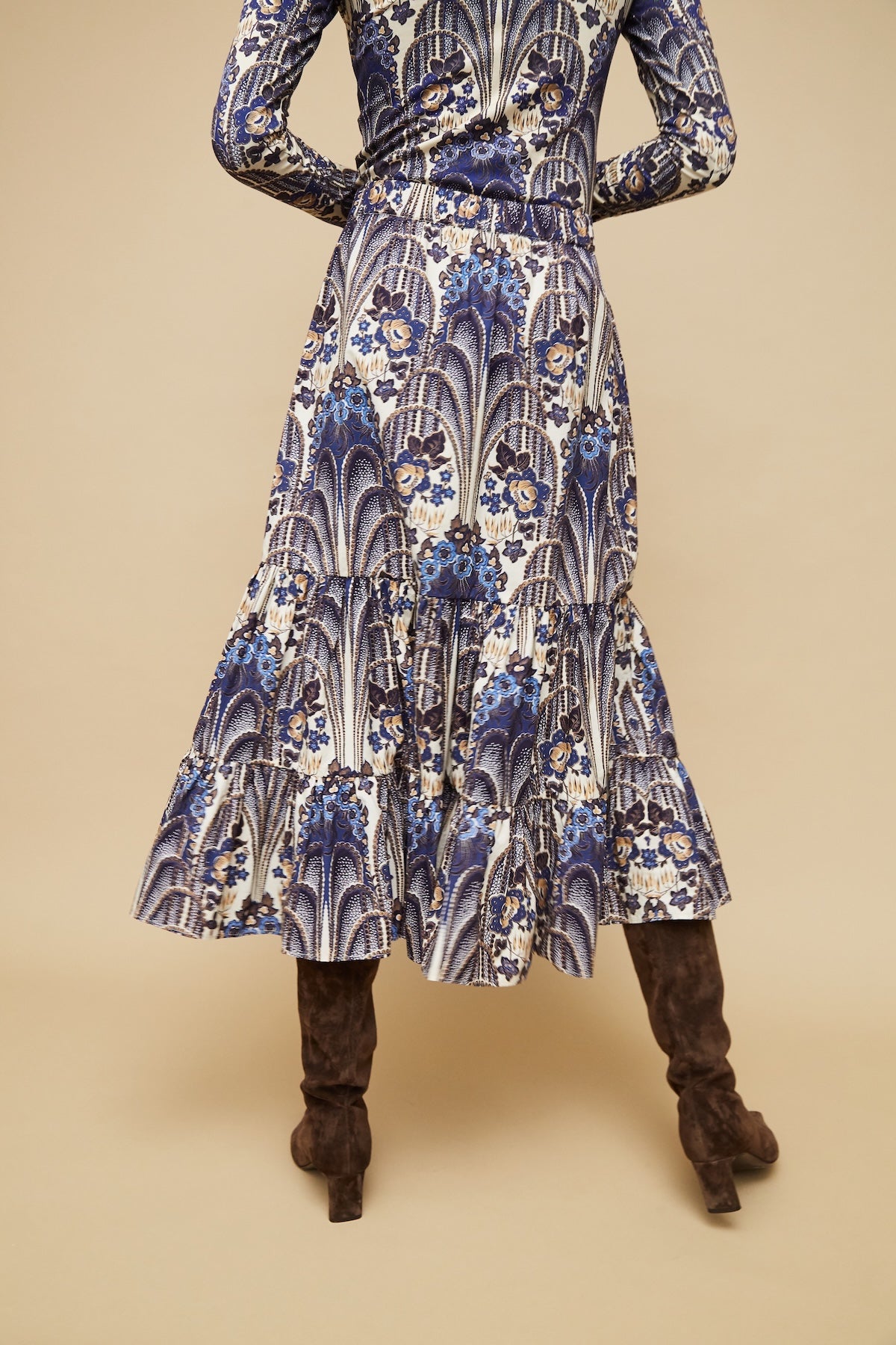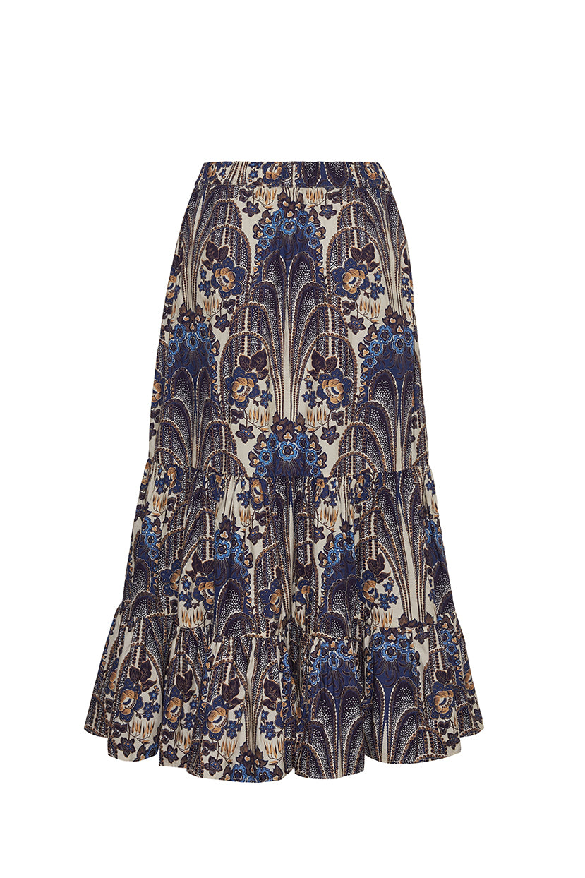 Pull on. Double tiered midi skirt with elastic waistband. Placed print. Unlined.