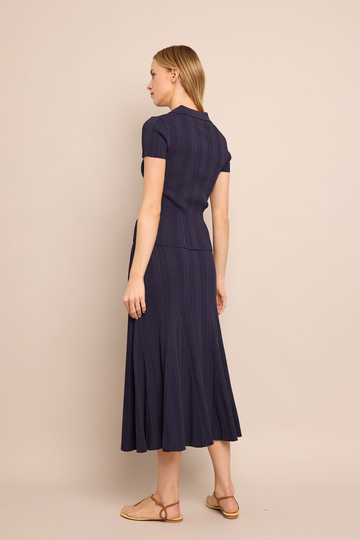 • Elastic waist midi length variegated rib knit trumpet skirt