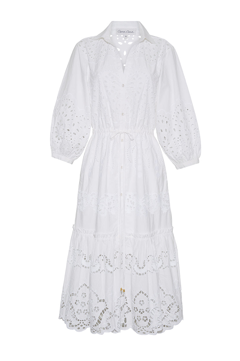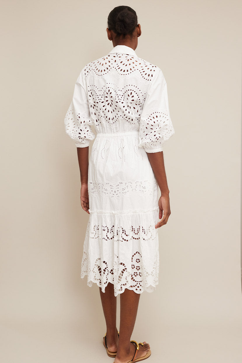 Embroidered cotton poplin. Collared neckline. Drawstring waist. Puffed sleeves. Midi hemline. Unlined. Front placket opening. Functional drawstring waistband. Sized for an easy fit.