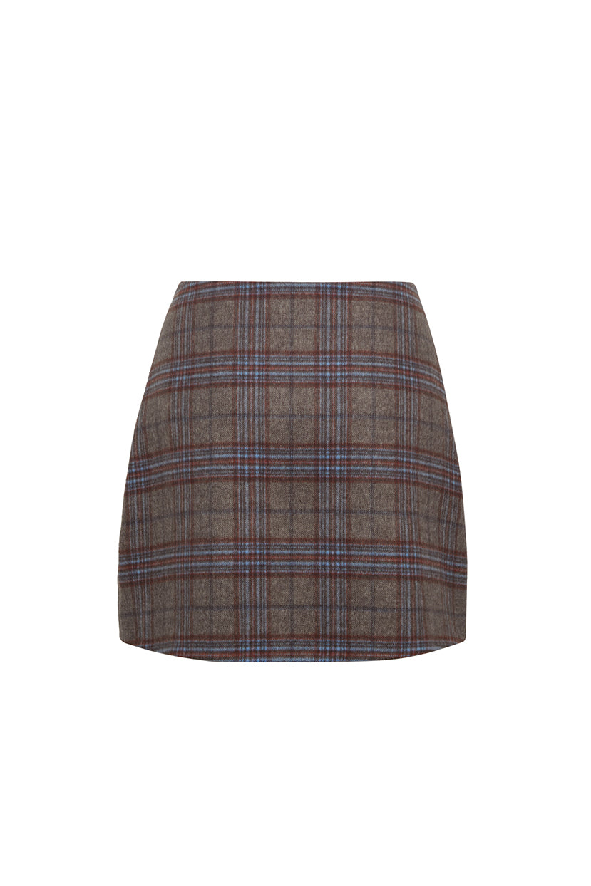 • Mini double-faced plaid wool wrap skirt with gold novelty snap closure at wearers left