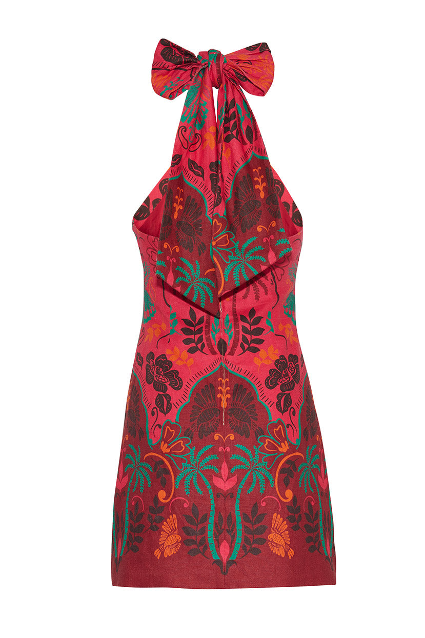 • Open back mini dress featuring a draped bodice with criss-cross halter neck that extends into self ties